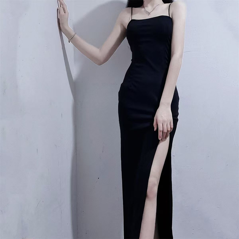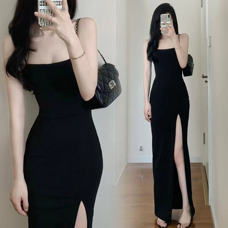 YF7228-图片色赫本风黑色吊带抹胸弹力包臀过膝开叉纯欲风夏季连衣裙