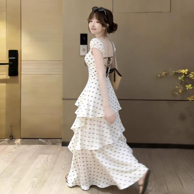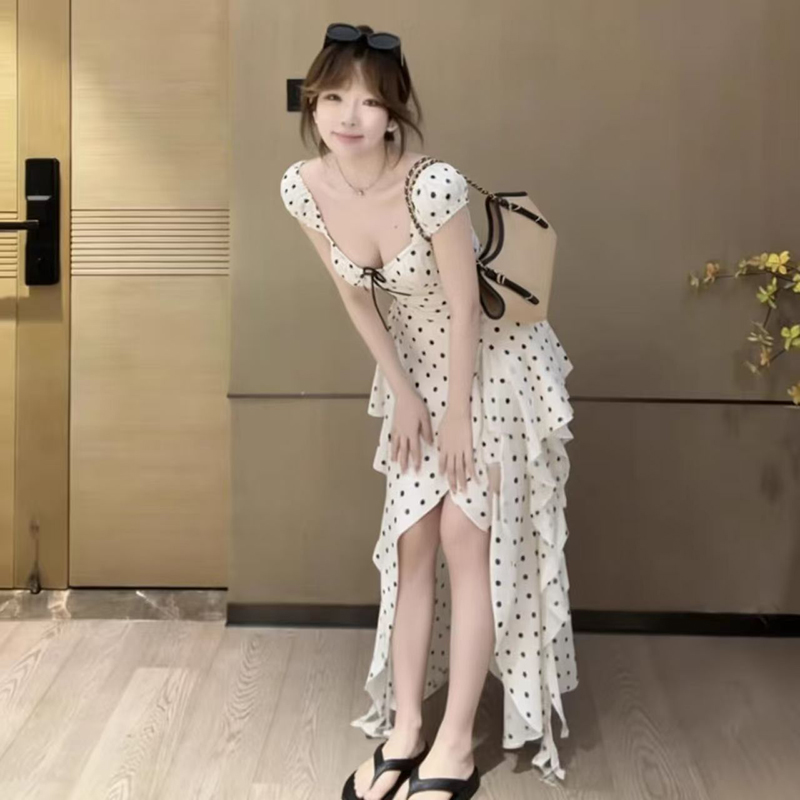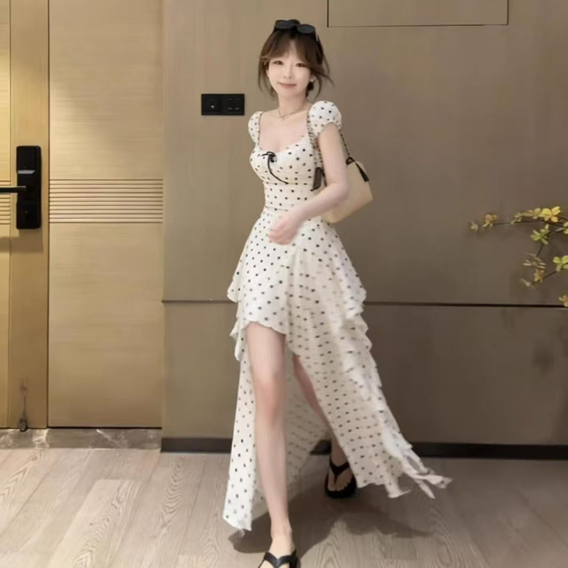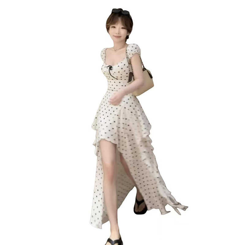 YF7232-图片色甜美时尚后背镂空绑带不规则裙摆设计波点白色雪纺连衣裙