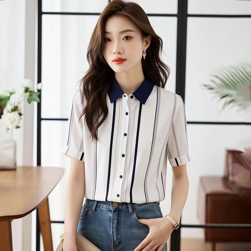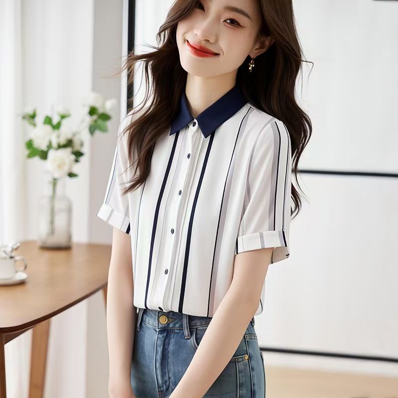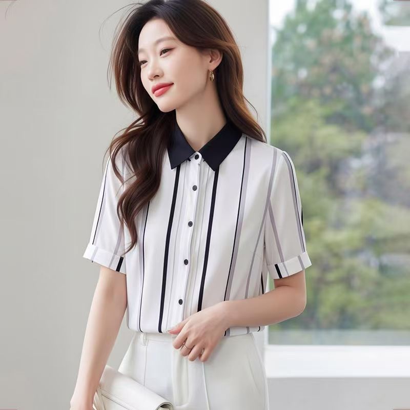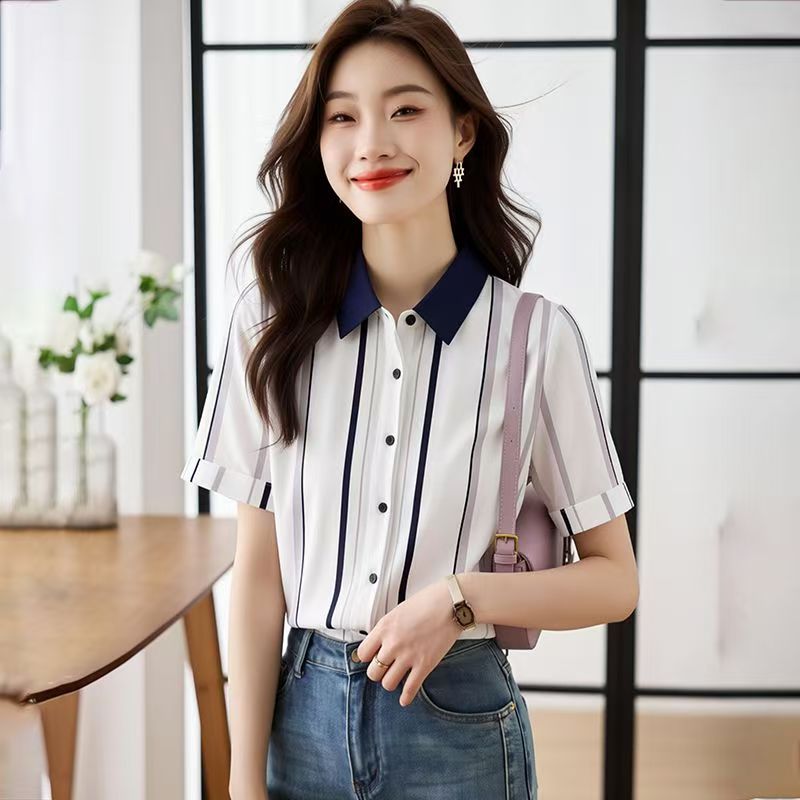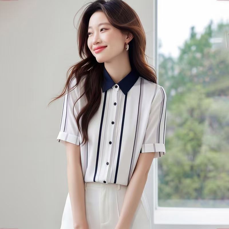 YF7233-图片色夏季时尚条纹撞色翻领系扣宽松显瘦短袖别致雪纺衫