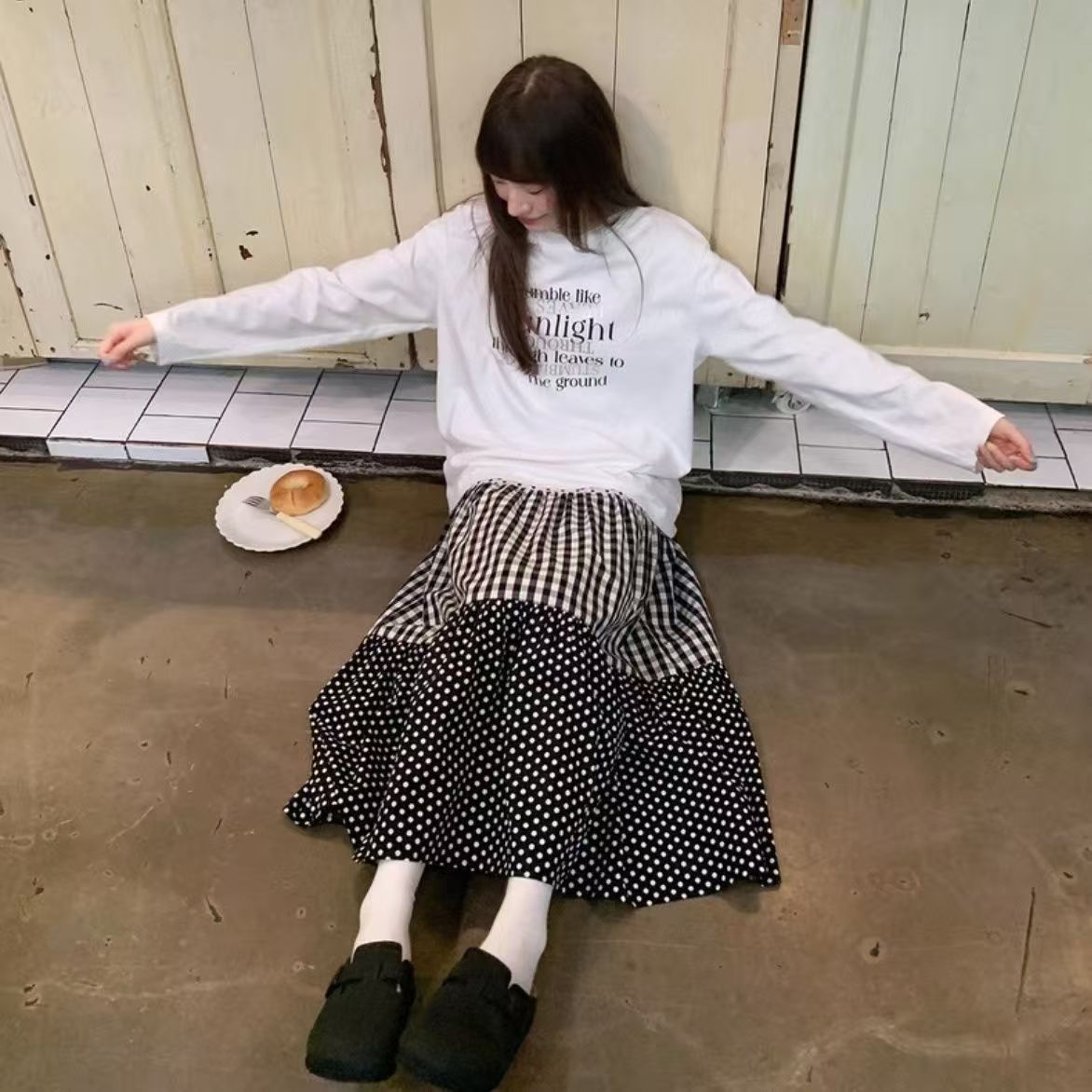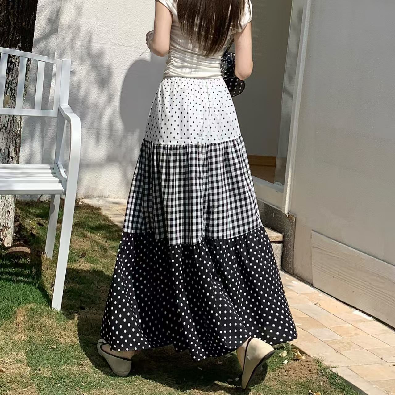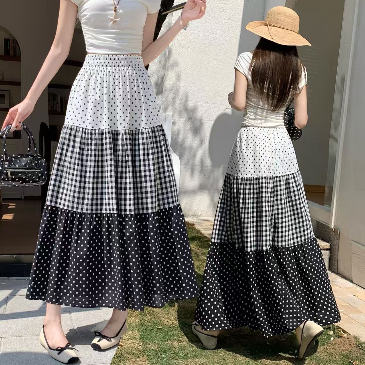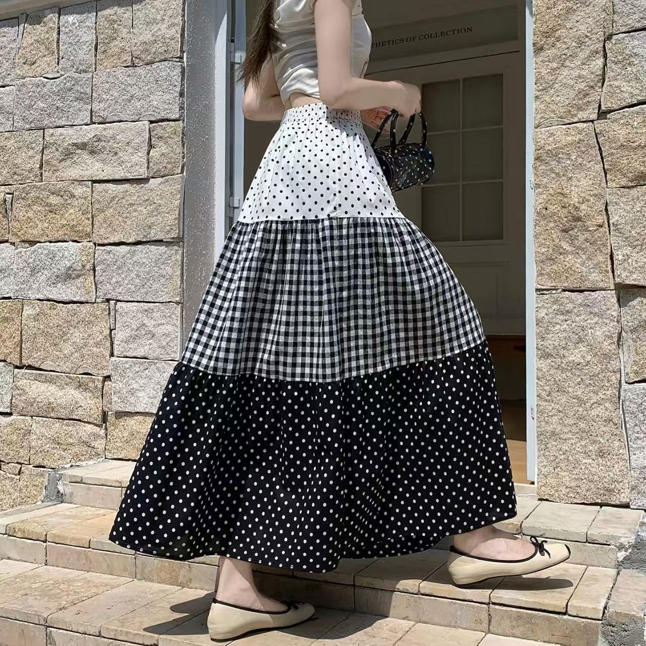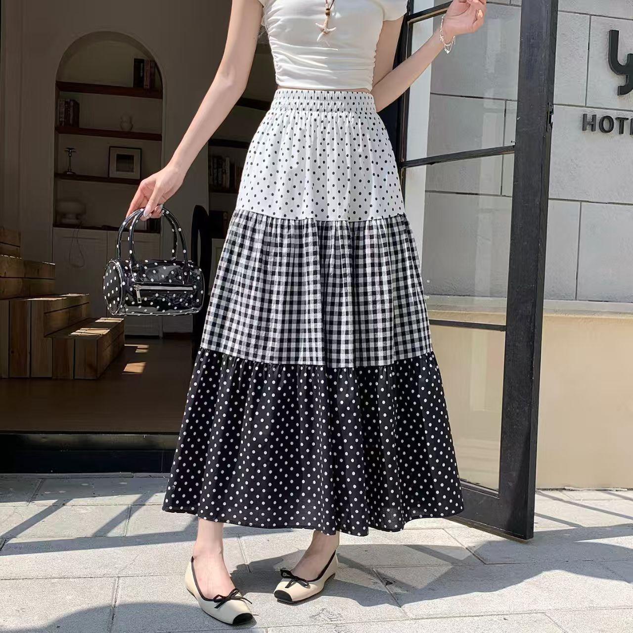 YF7236-图片色波西米亚复古风三层波点格子拼接中长款简约风半身裙子