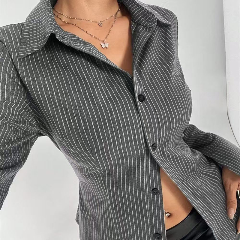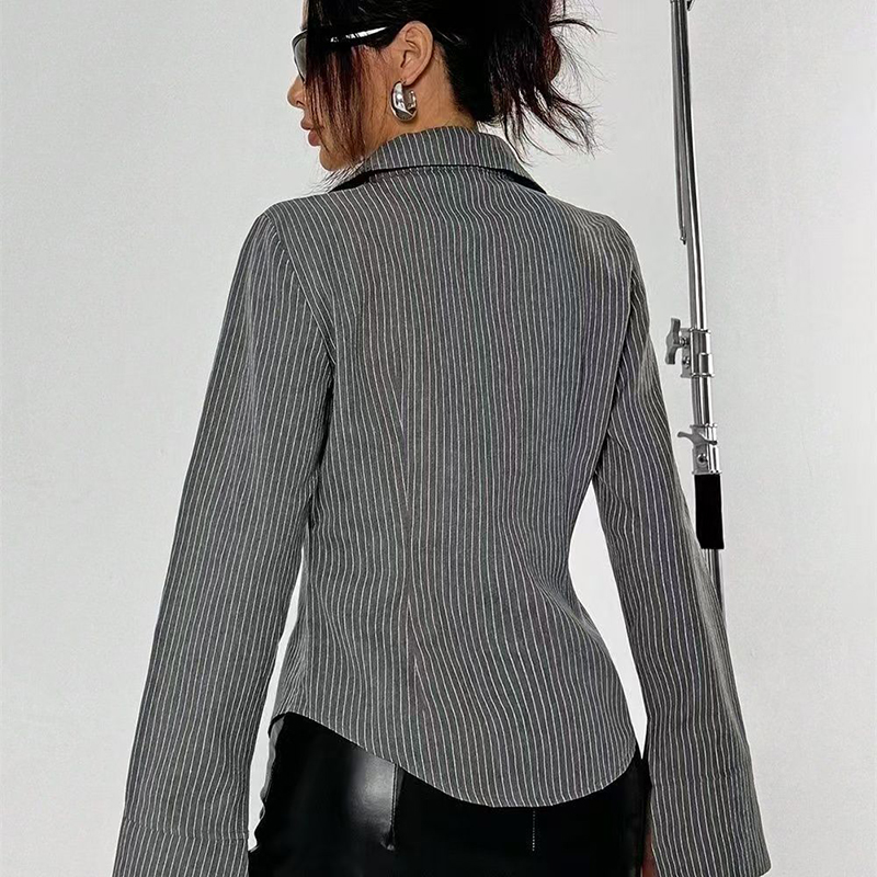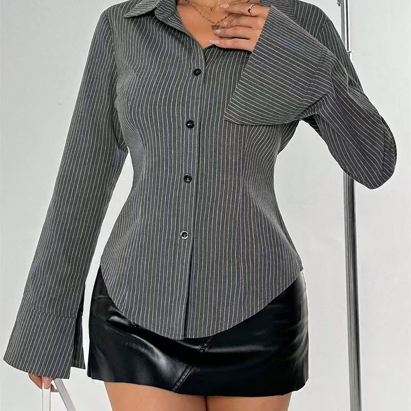 YF7241-图片色时尚条纹弧边修身显瘦微喇叭长袖翻领复古气质上衣