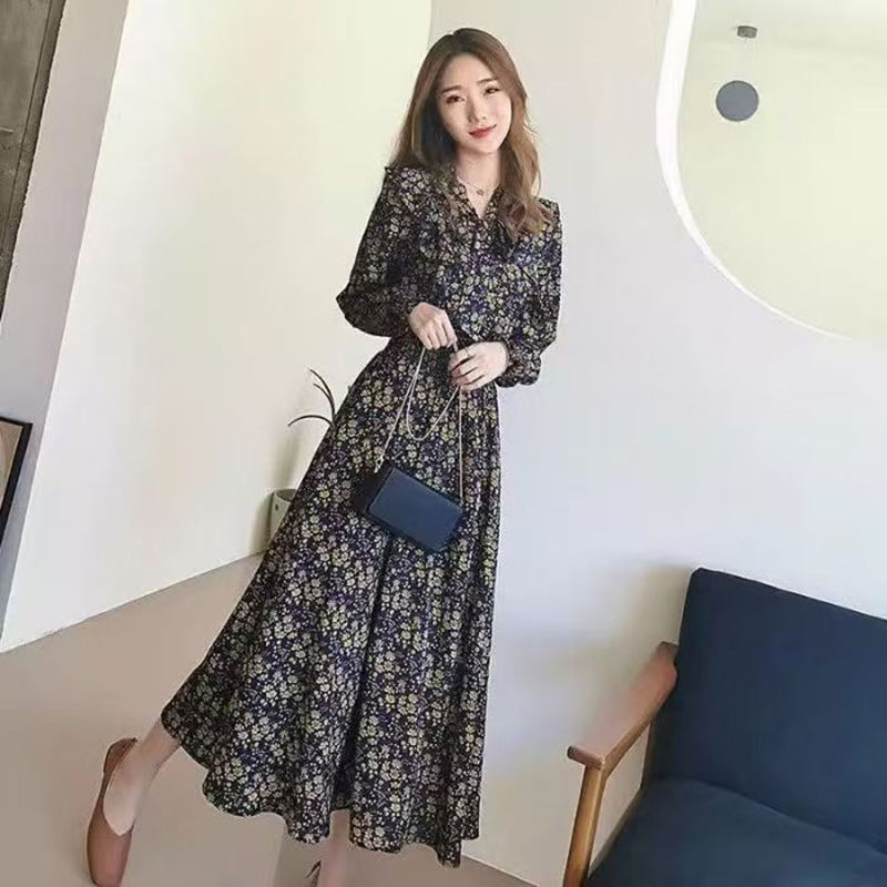 YF7244-图片色法式碎花连衣裙 泡泡系蝴蝶结荷叶边女神范黑色雪纺长裙