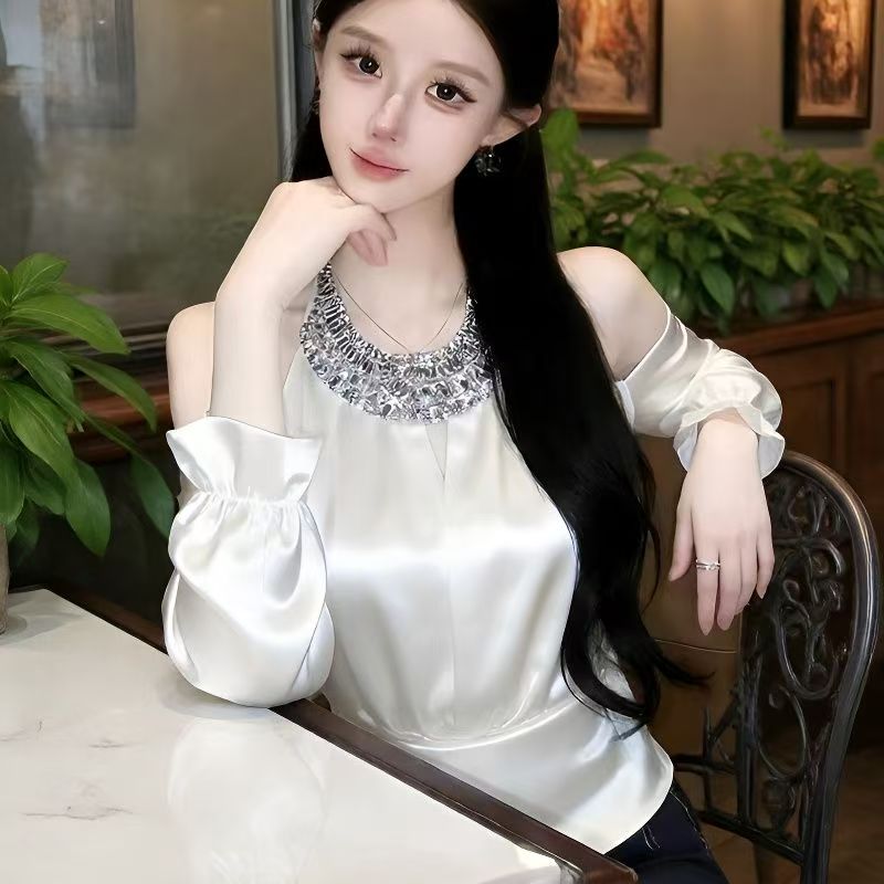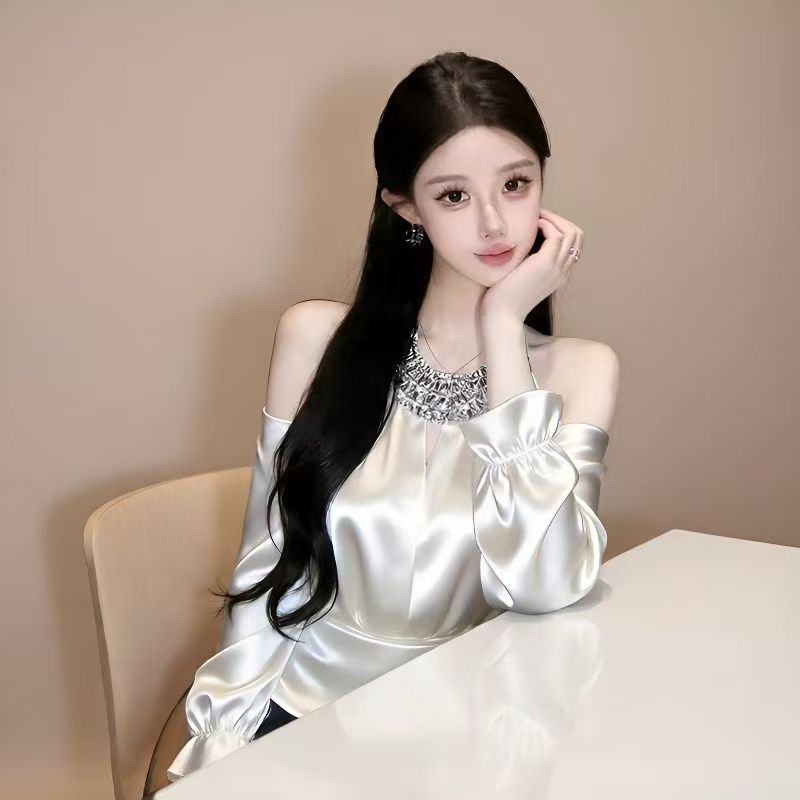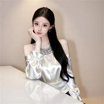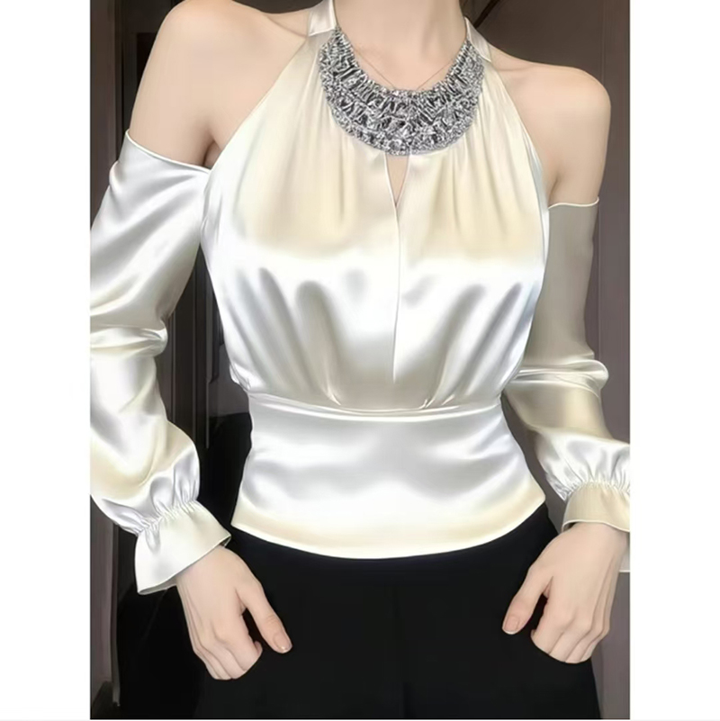 YF7248-图片色名媛气质烫钻围脖镂空露肩长袖褶折修身缎面轻奢上衣