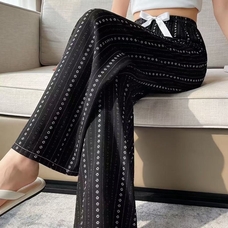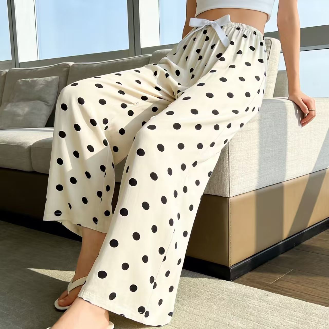 YF7251-(2色入内)夏天新款松紧腰绑绳直筒坠地感薄款清爽绸质提花波点阔腿裤