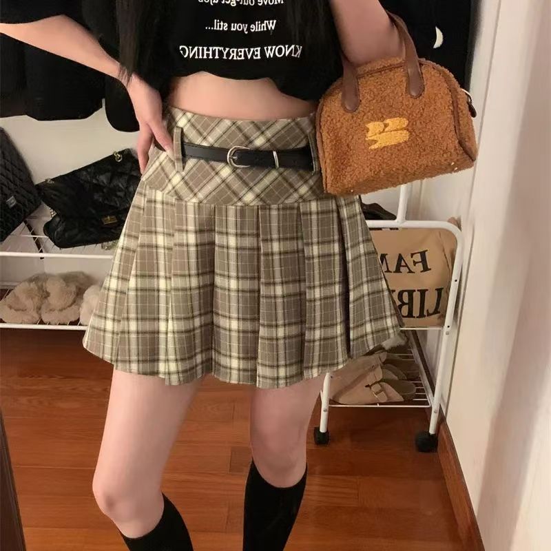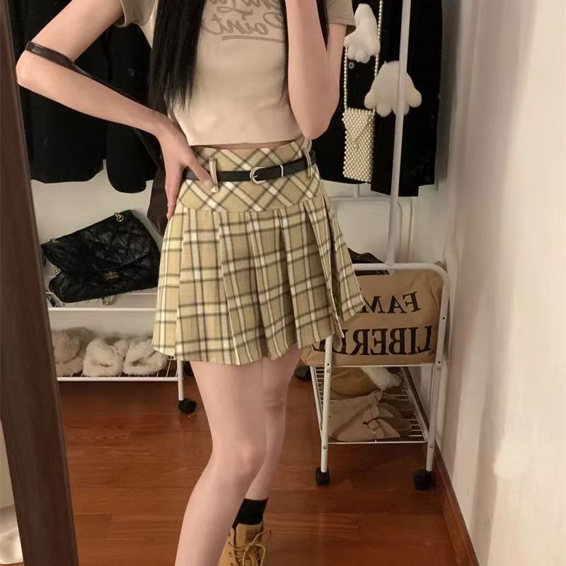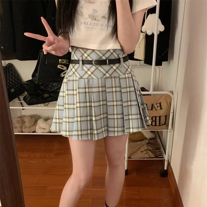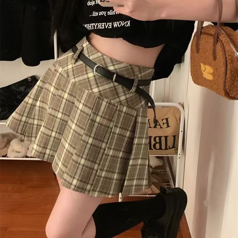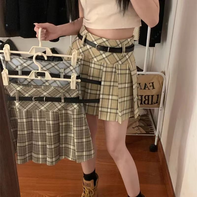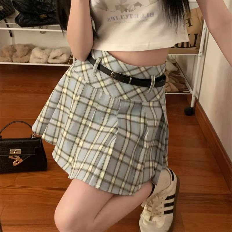 YF7253-(3色入内)日系原宿风复古格子百褶高腰A字拼接夏季防走光内裤短裙