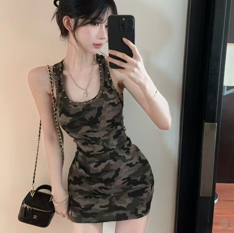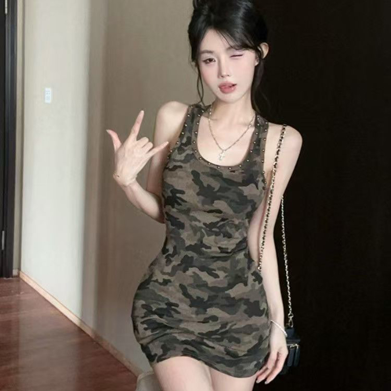 YF7254-图片色韩版夏季铆钉围边套头弹力修腰包臀迷彩印花吊带连衣裙