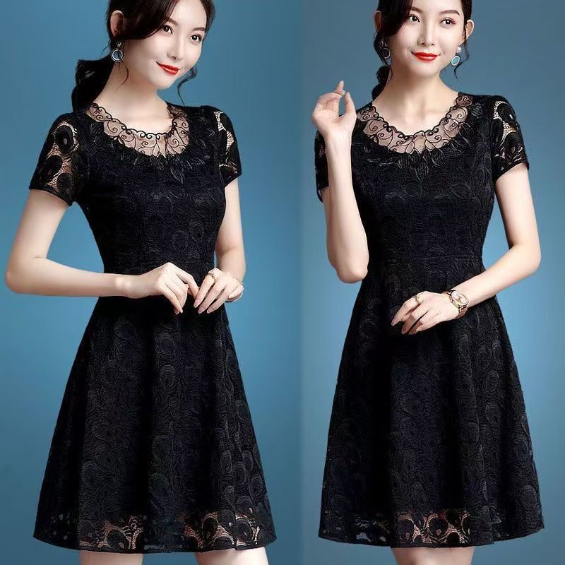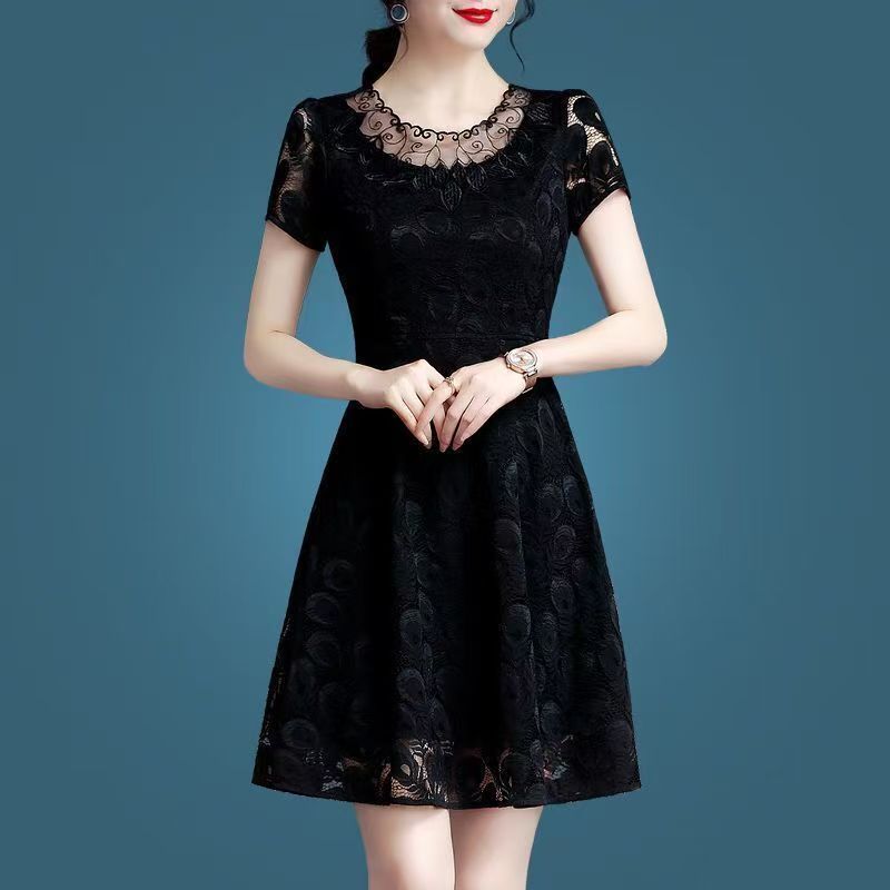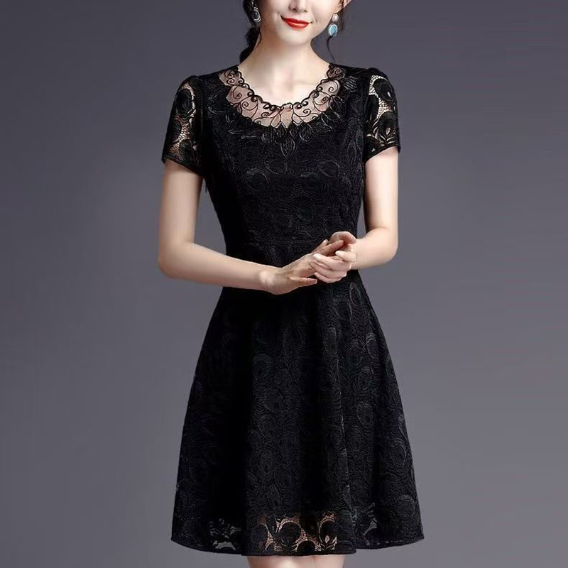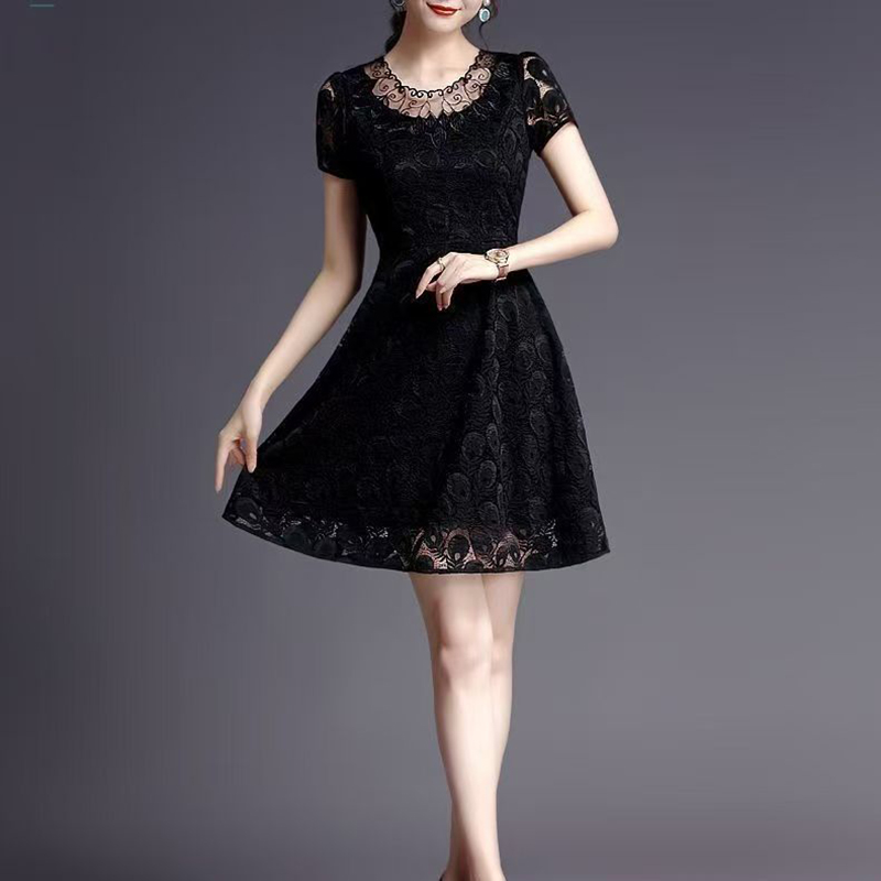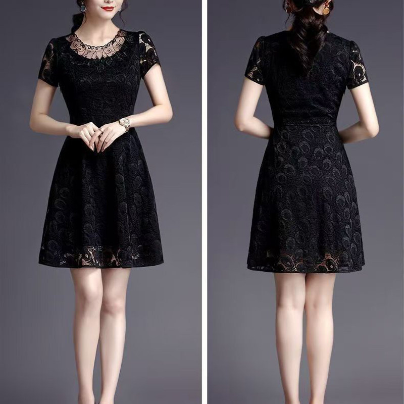 YF7263-图片色名媛气质镂空套头修腰显瘦黑色短袖蕾丝夏季新款连衣裙
