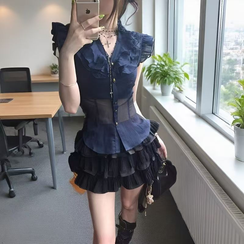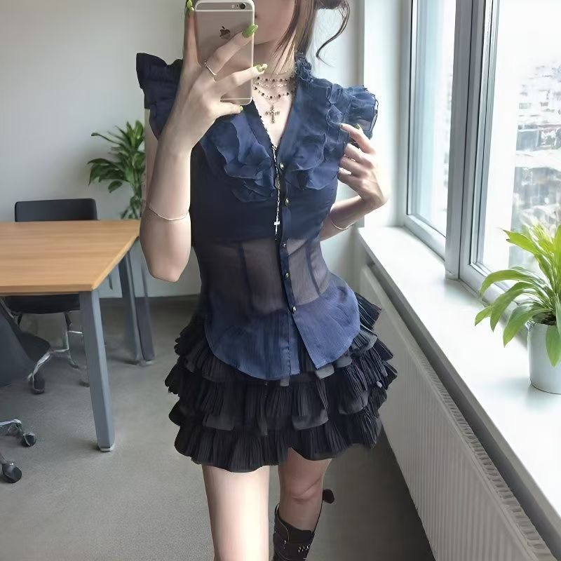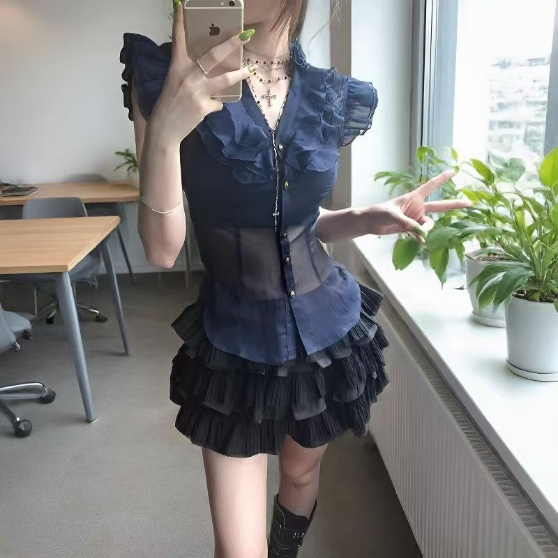 YF7264-图片色小香风小飞袖拉链透视修腰荷叶边复古风系扣法式雪纺衫