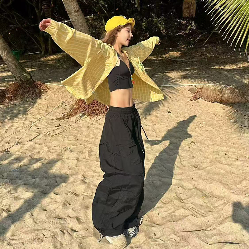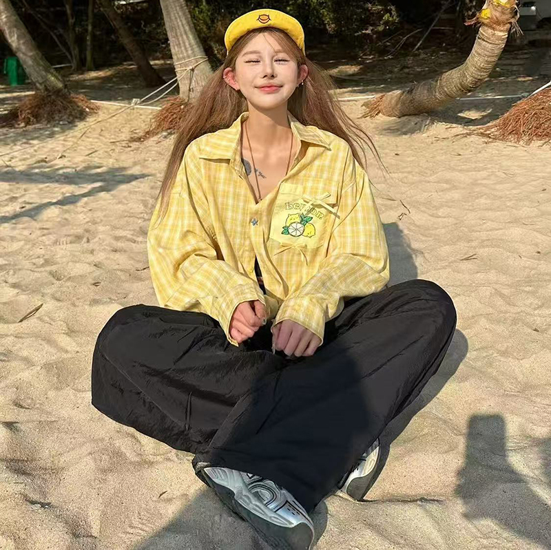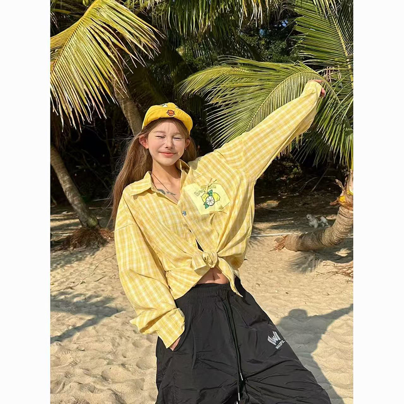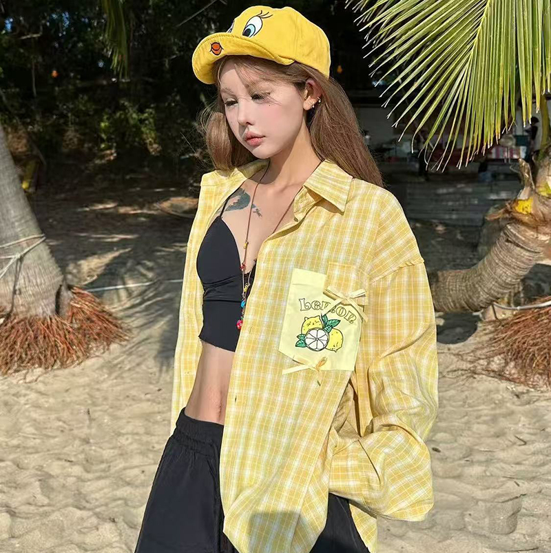 YF7275-图片色港式小心机水果印花口袋慵懒风大码趣味气质格子上衣