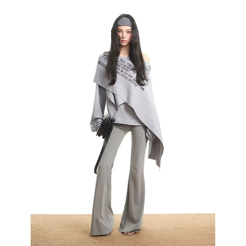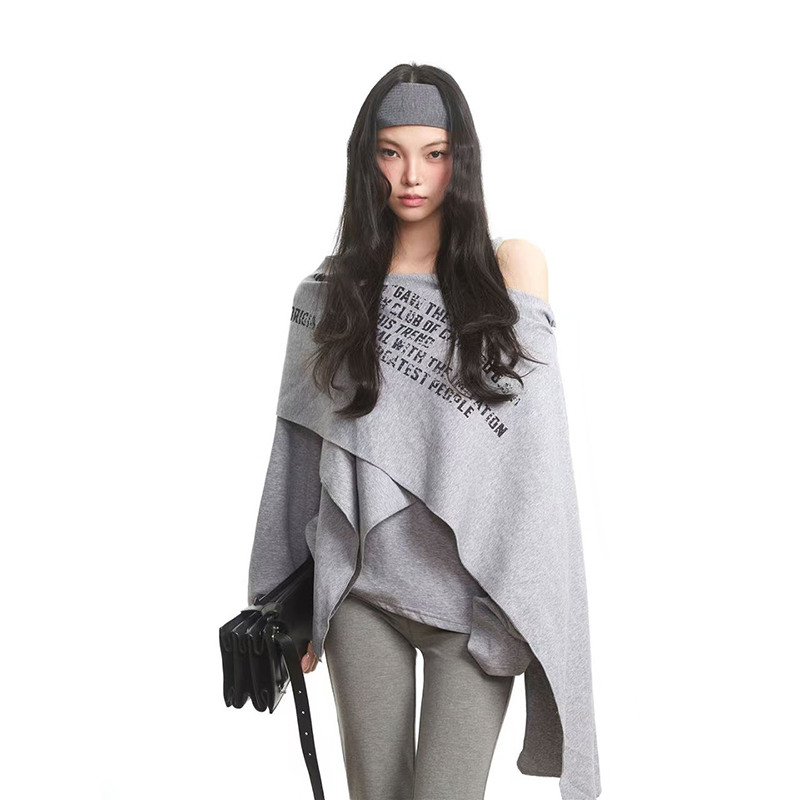 YF7276-图片色韩版一字肩字母印花不规则露肩休闲显瘦大码辣妹卫衣上衣