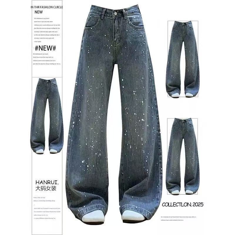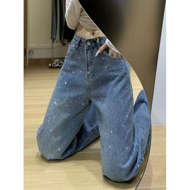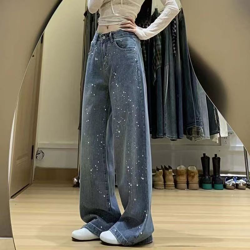 YF7281-图片色韩系烫钻满天星设计系扣高腰直筒阔腿复古蓝新款牛仔裤