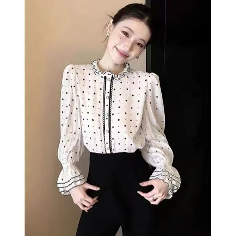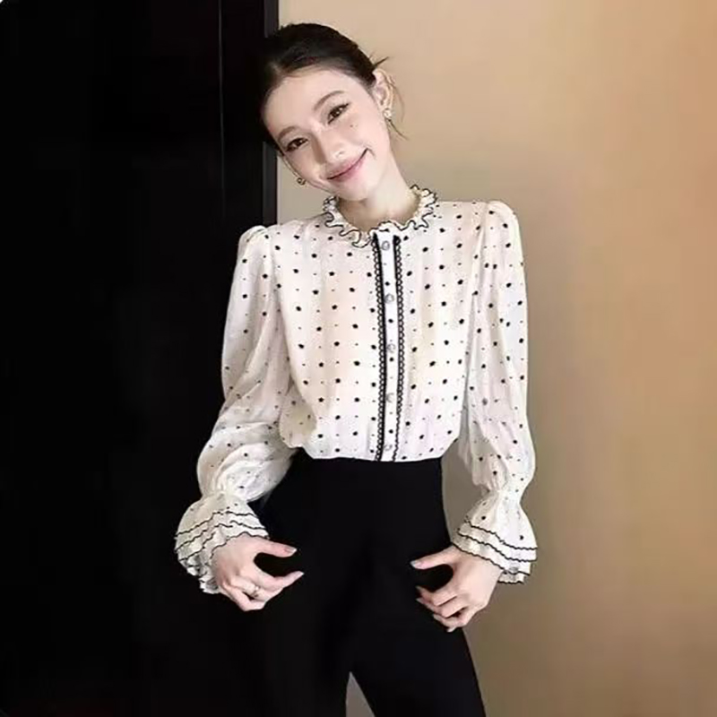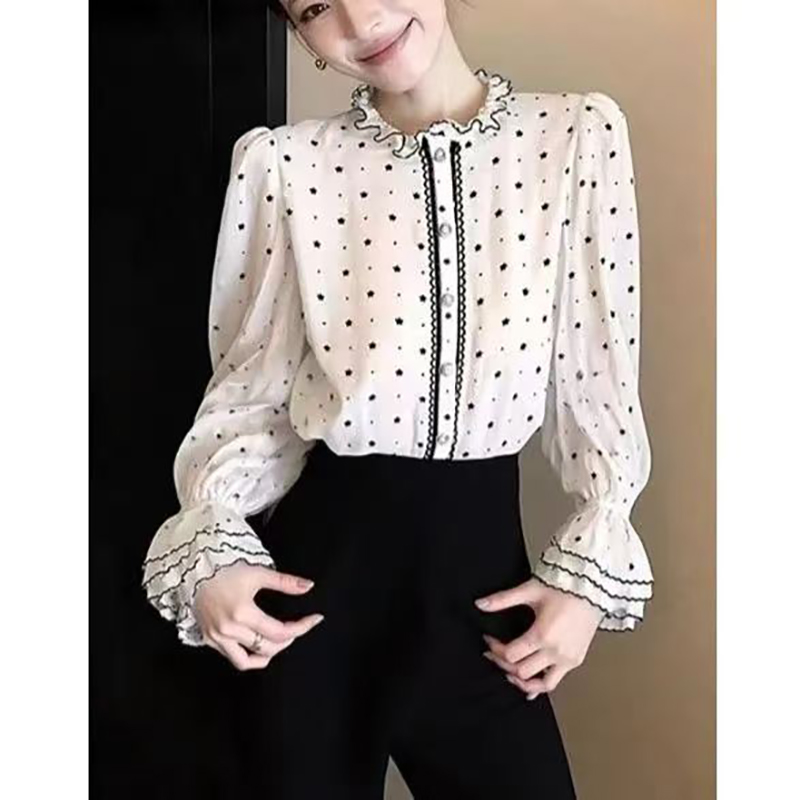 YF7290-图片色优雅时尚气质花边卷领撞色排扣宽松显瘦波点雪纺衫