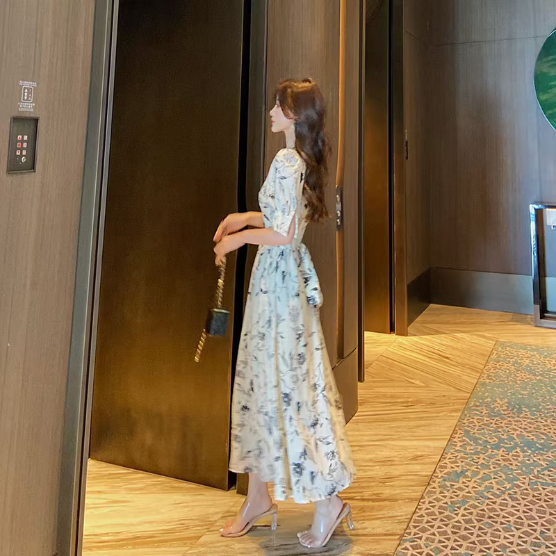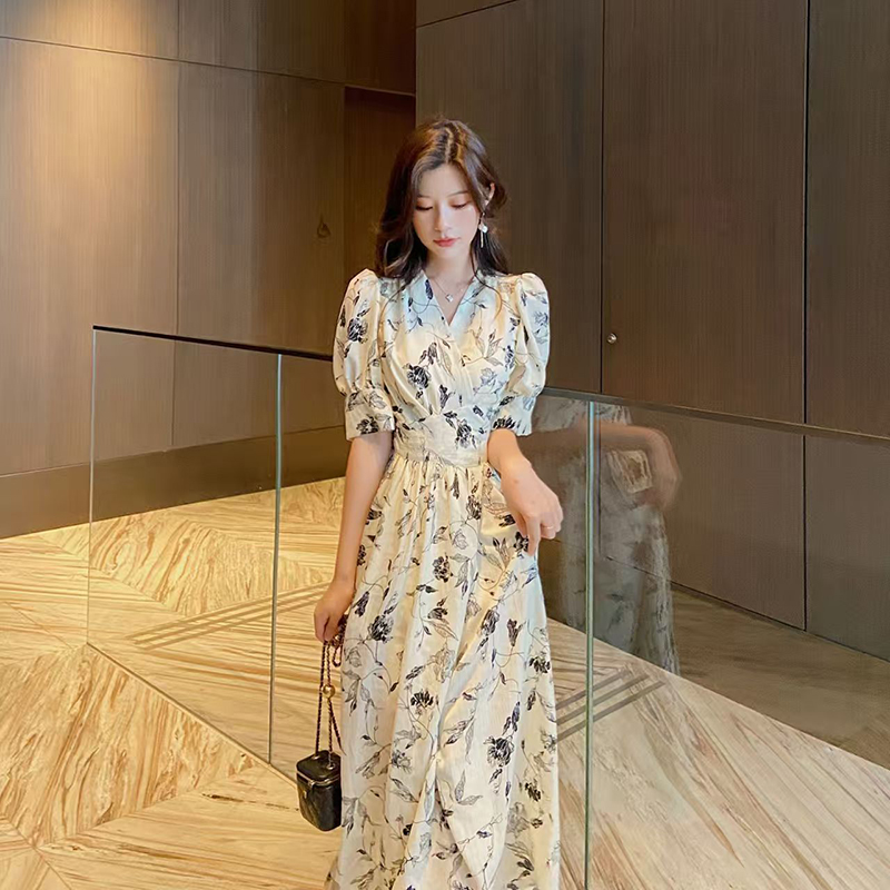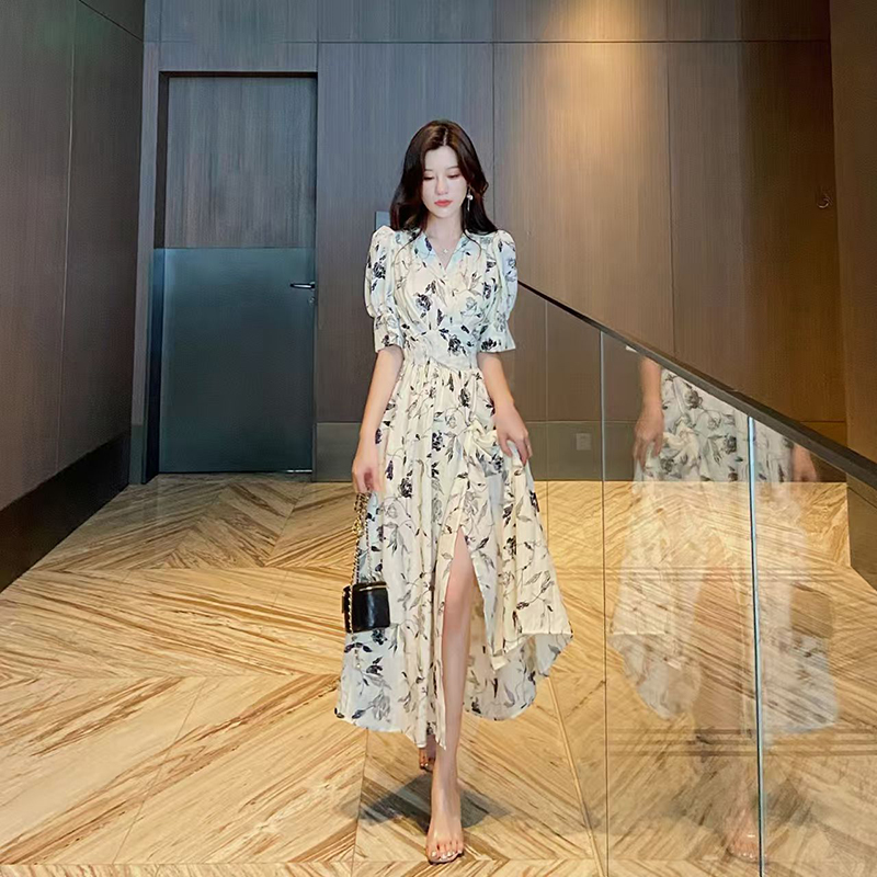 YF7400-图片色高端感夏天泡泡袖V领修腰开叉碎花优雅气质新款连衣裙