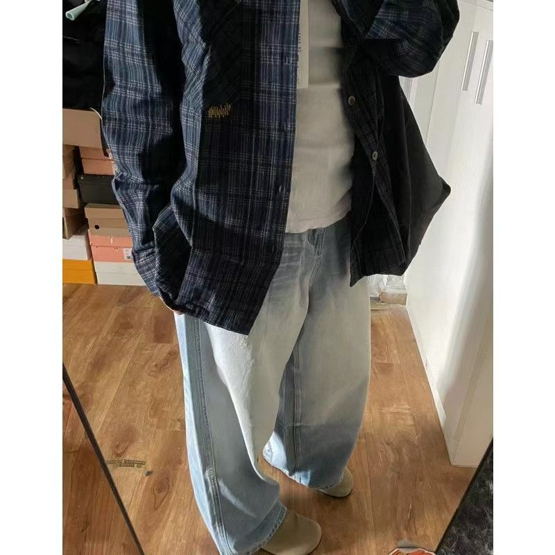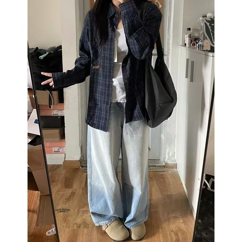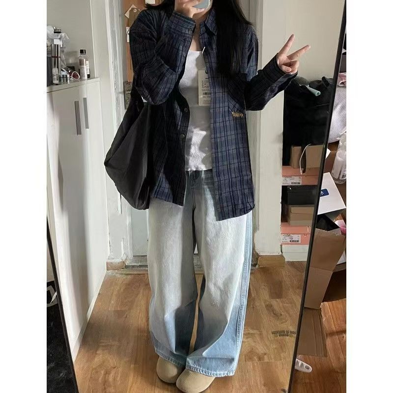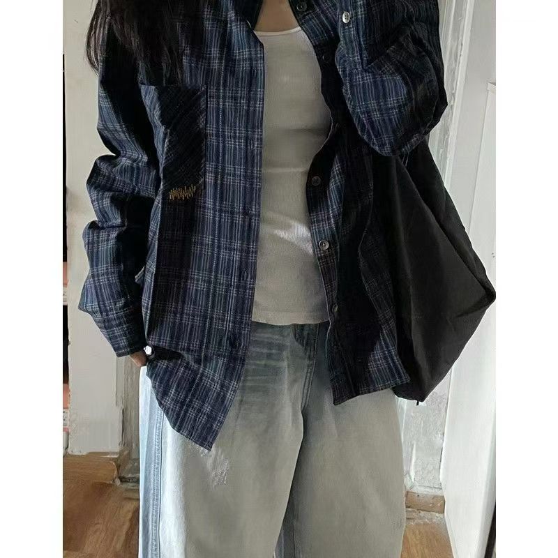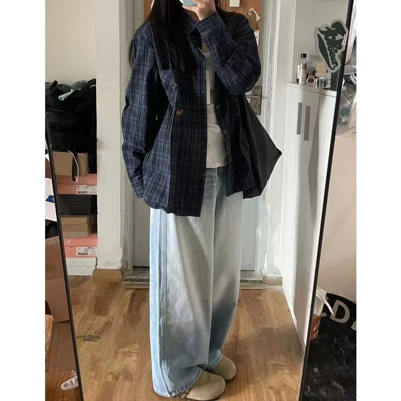 YF7402-图片色原宿风复古格子长袖翻领宽松大码显瘦慵懒风衬衣潮
