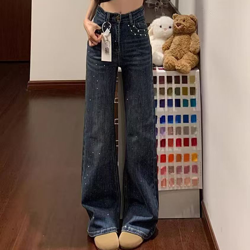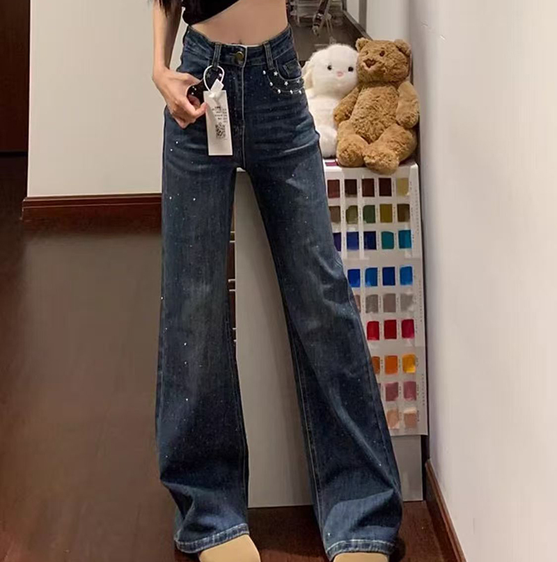 YF7404-图片色时尚辣妹复古蓝口袋铆钉满天星烫钻设计直筒坠地感牛仔裤