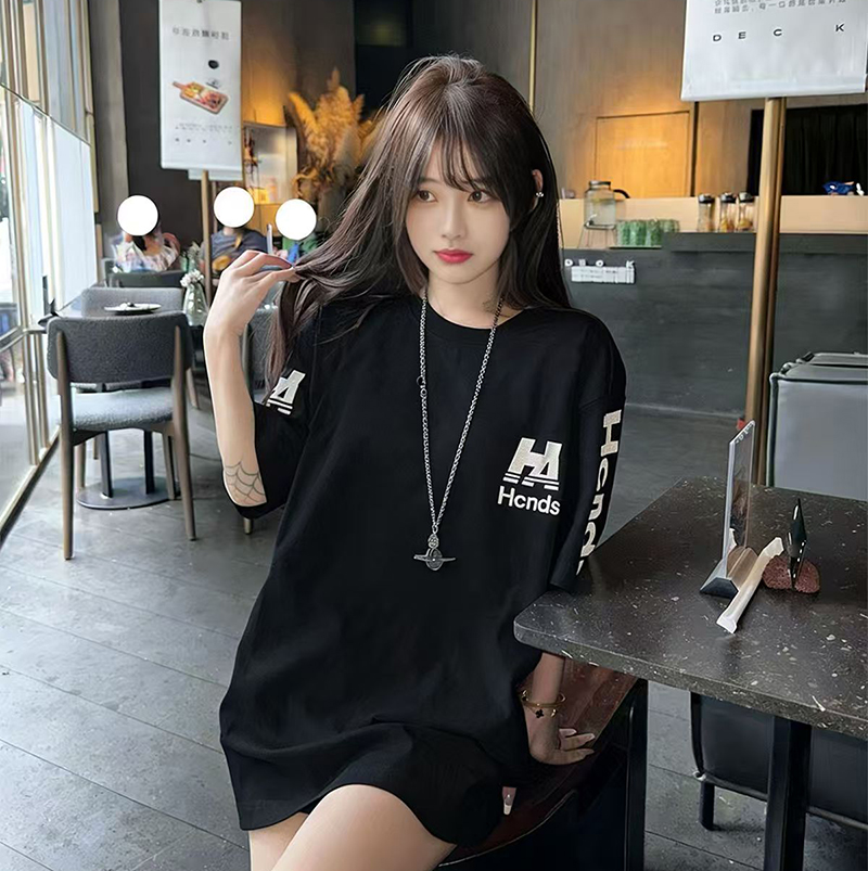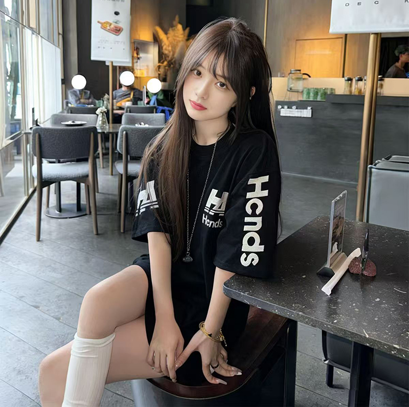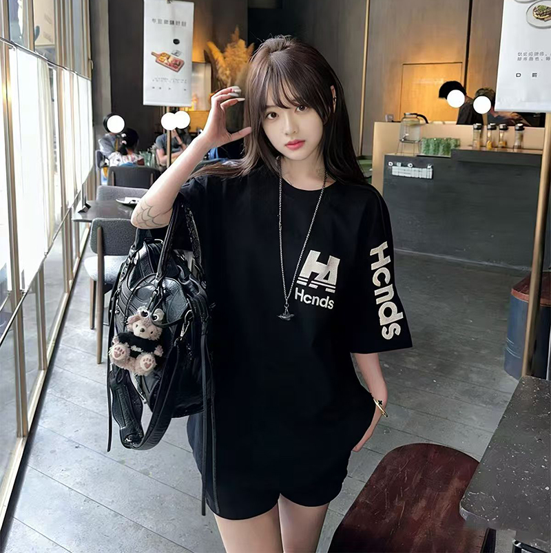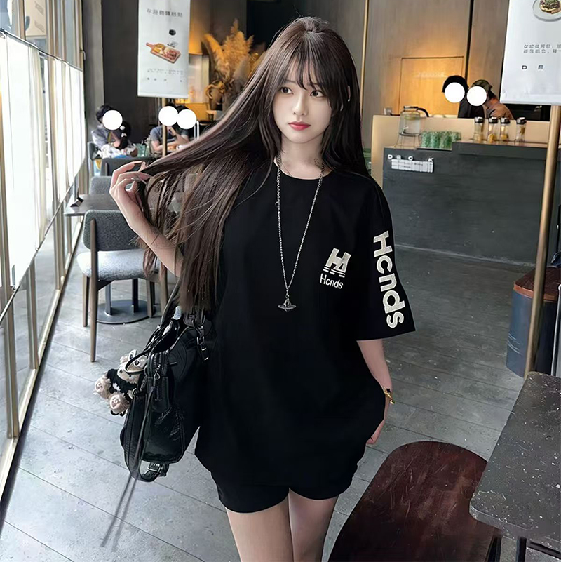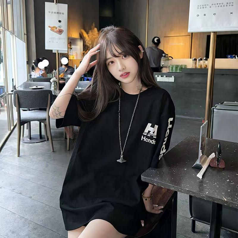 YF7409-(2色入内)港式慵懒风字母印花圆领短袖宽松大码简约气质T恤潮
