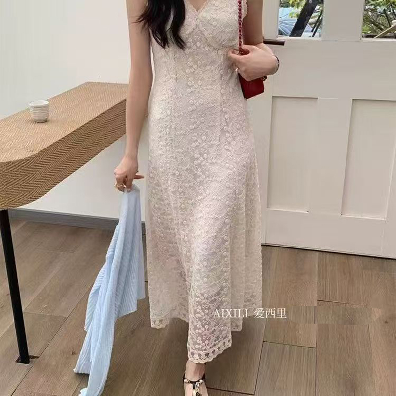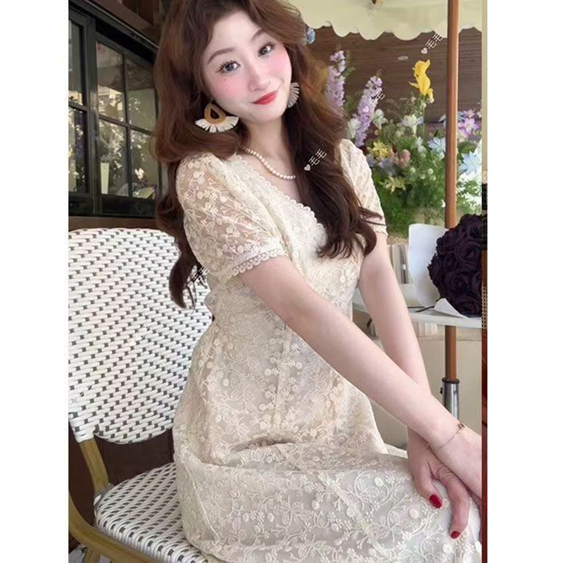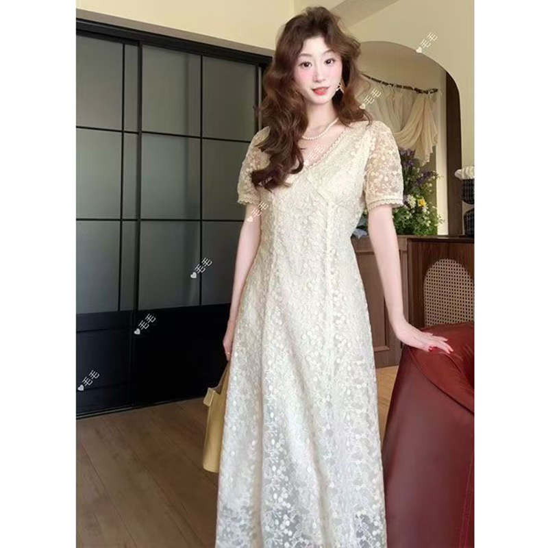 YF7411-图片色夏日度假风镂空勾花设计短袖V领修腰坠地感觉蕾丝连衣裙