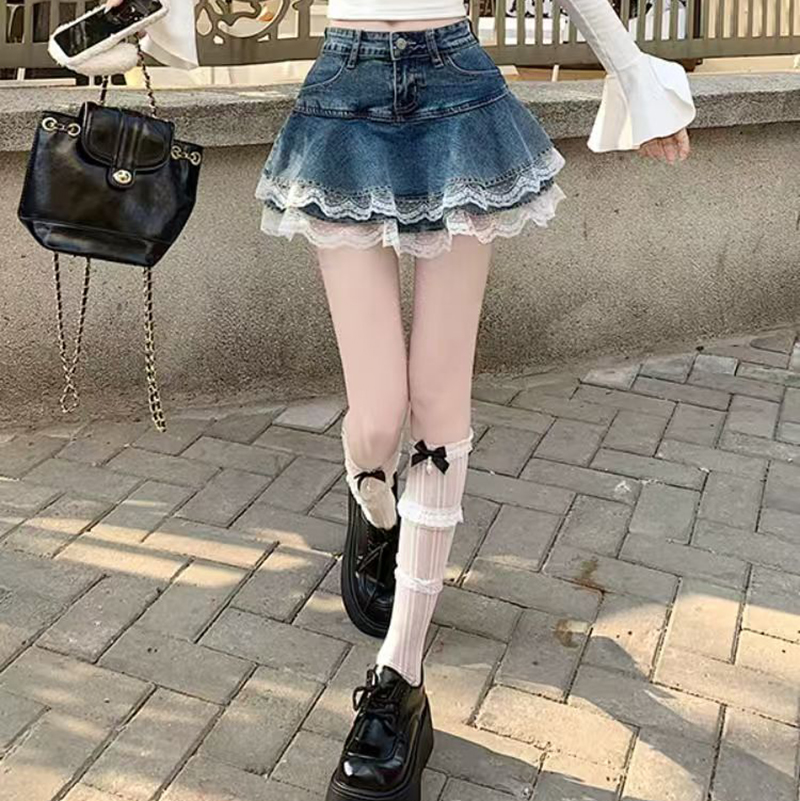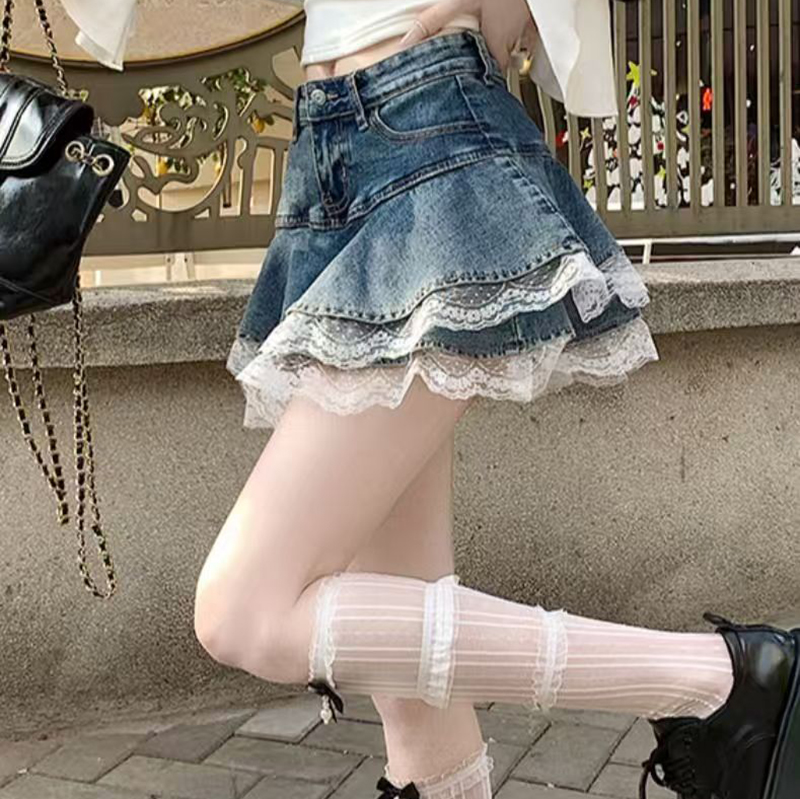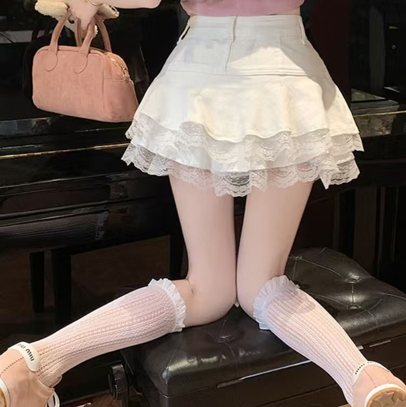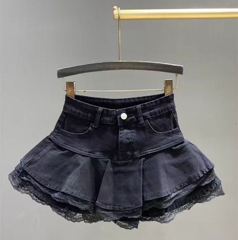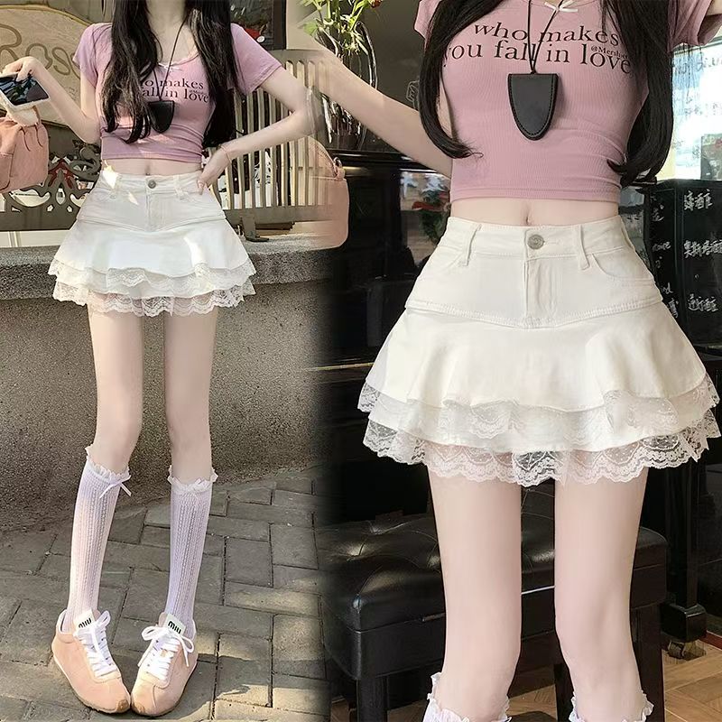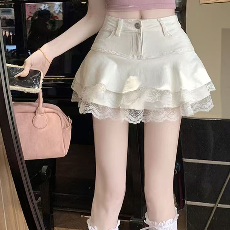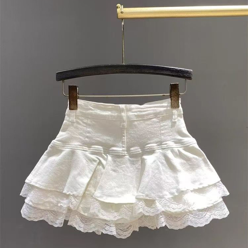 YF7412-(3色入内)夏季时尚系扣高腰褶折蓬蓬蕾丝拼接防走光蛋糕防走光短裙