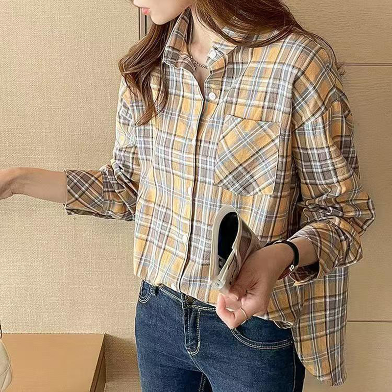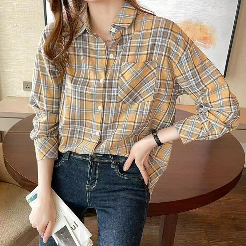 YF7440-图片色港式慵懒风长袖翻领复古格子宽松显瘦休闲百搭上衣