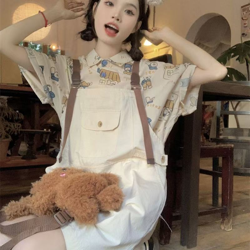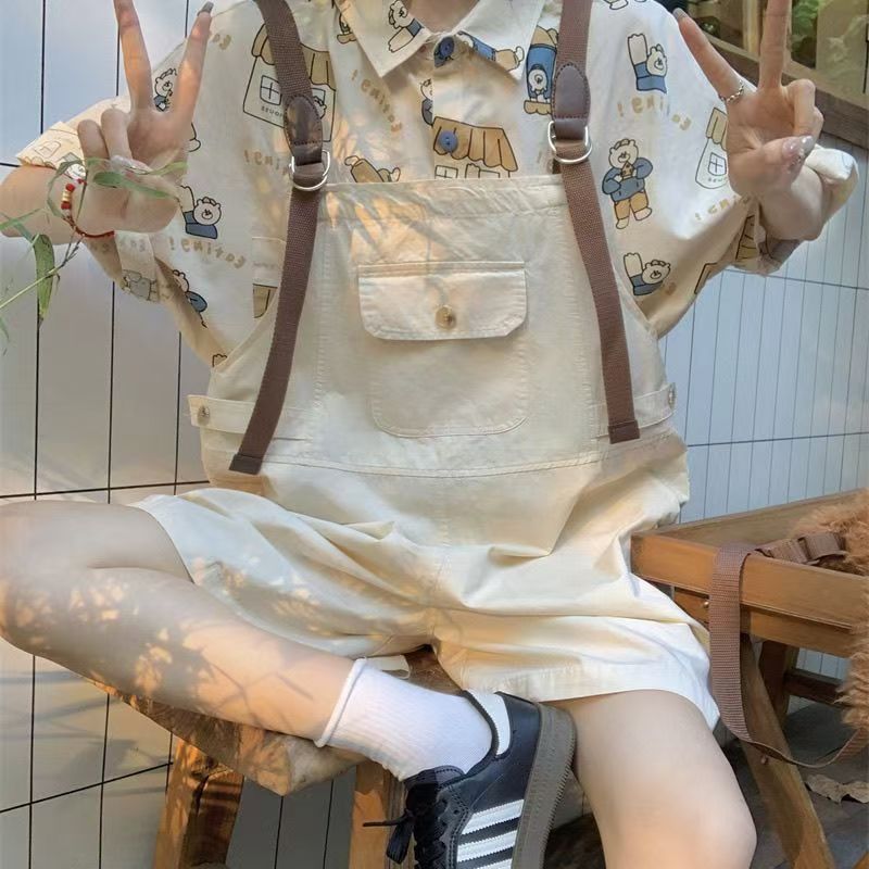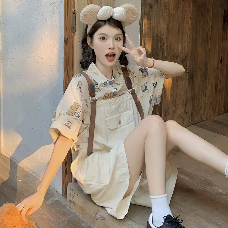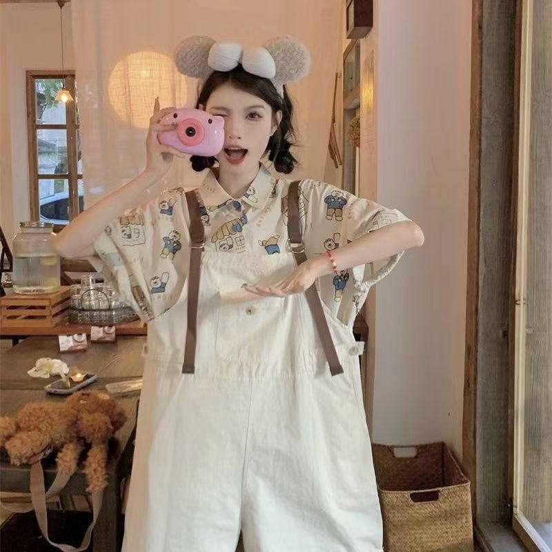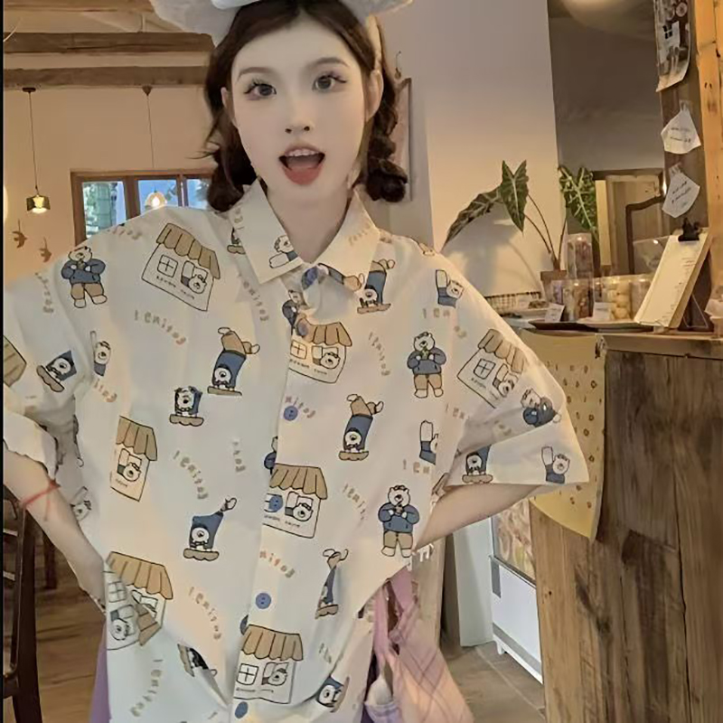 YF7442-图片色夏季小可爱熊熊印花慵懒风短袖POLO领宽松显瘦日系衬衣