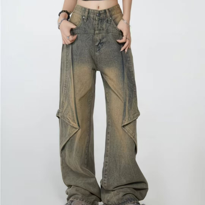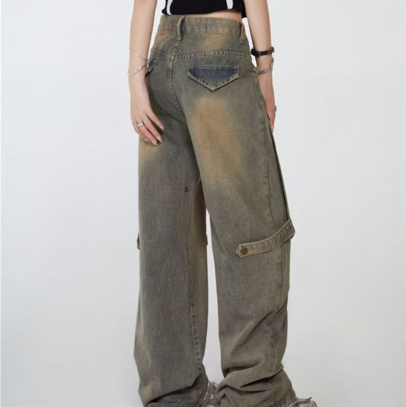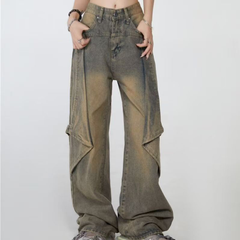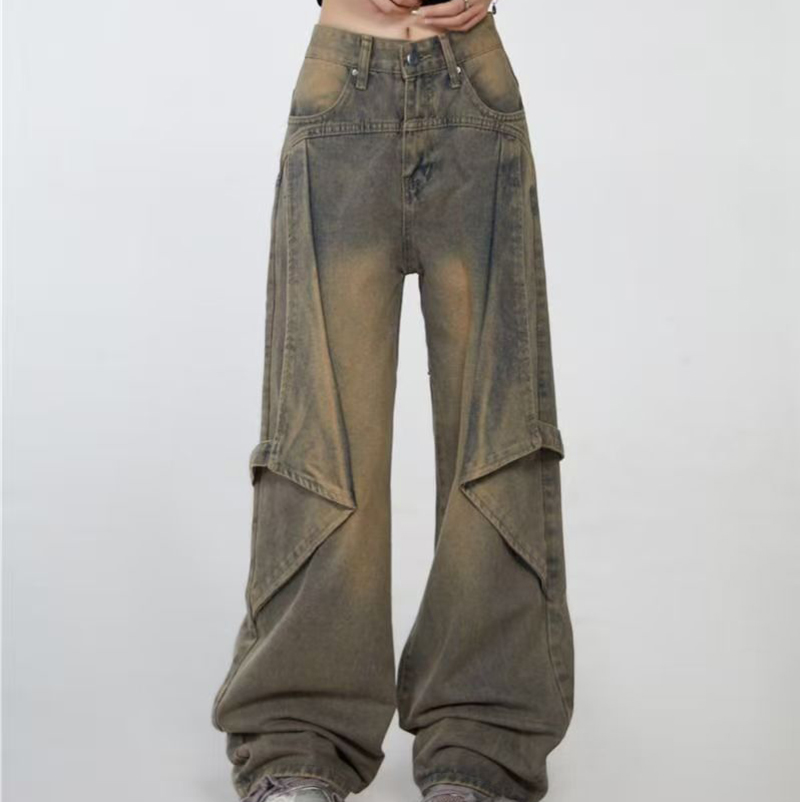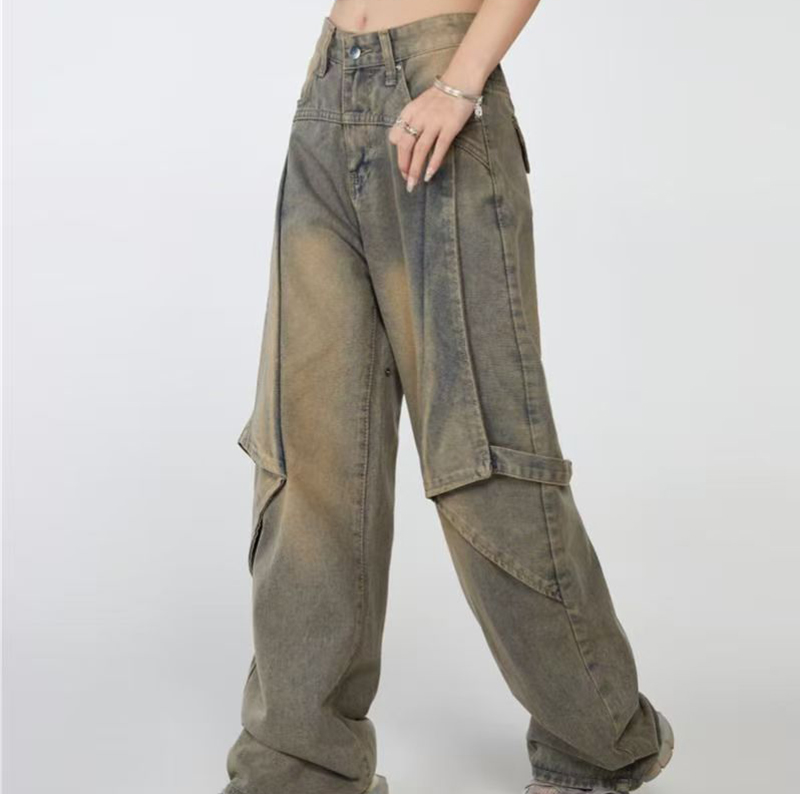 YF7443-图片色慵懒风时尚新款不规则拼接复古蓝直筒美式牛仔裤