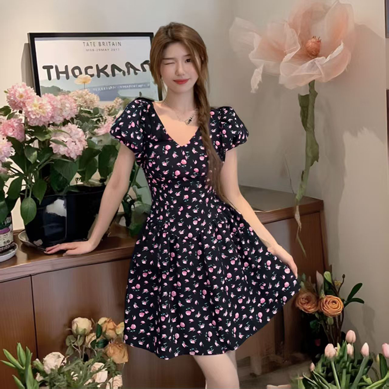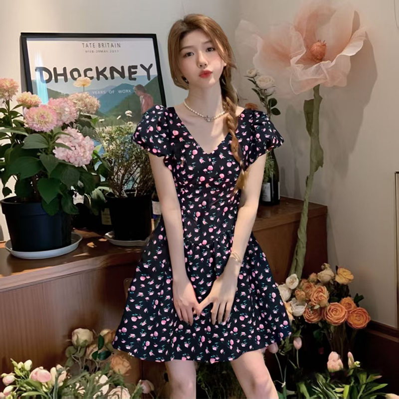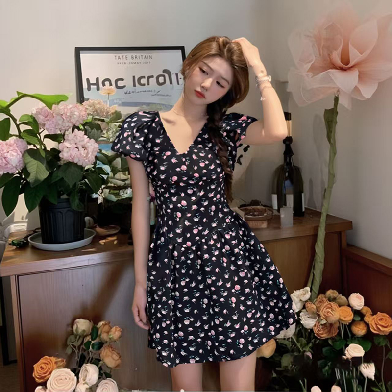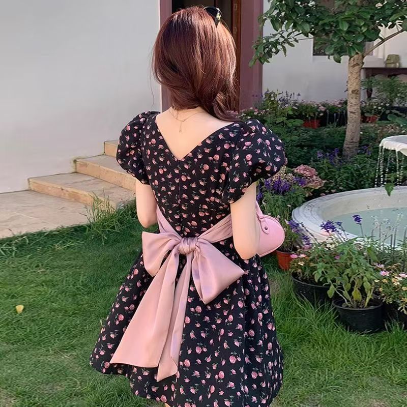 YF7444-图片色夏天小清爽后背绑带蝴蝶结设计黑色碎花V领短袖法式连衣裙