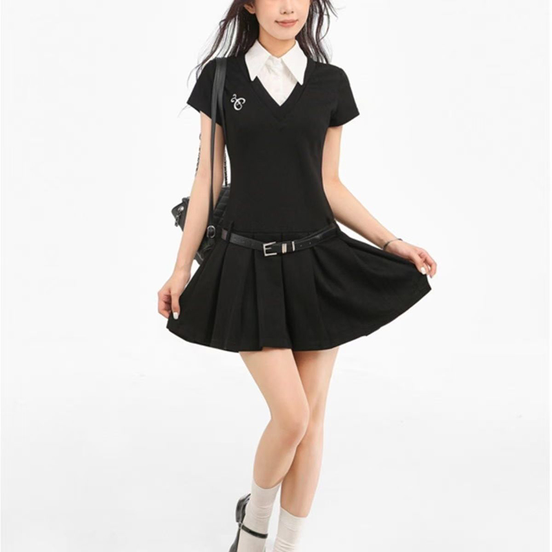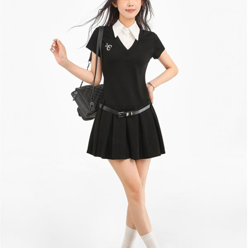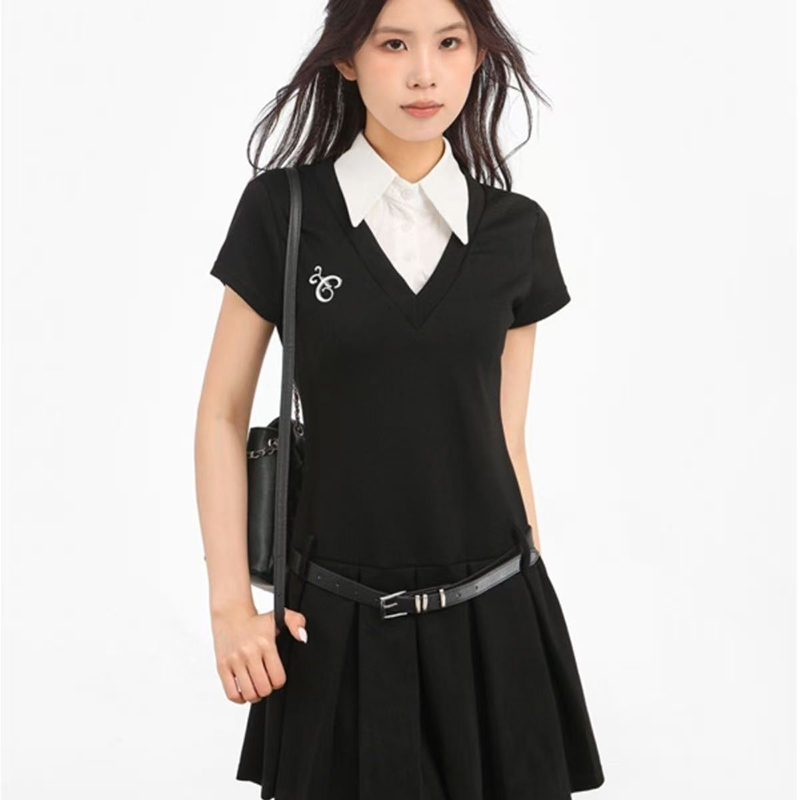 YF7445-图片色黑色假两件POLO领拼接收腰褶折感字母印花学院派连衣裙