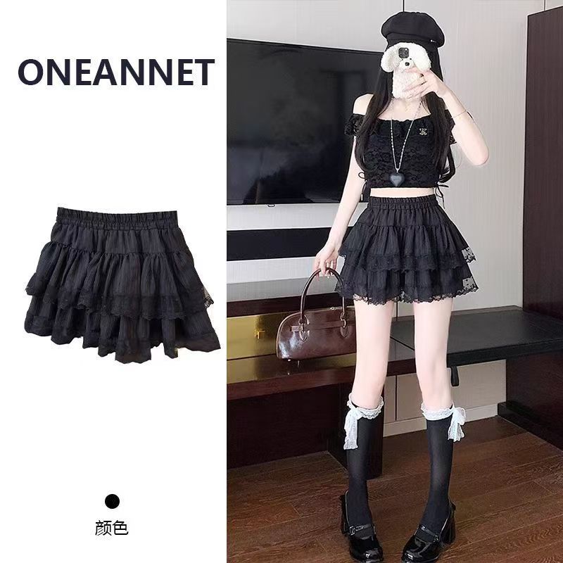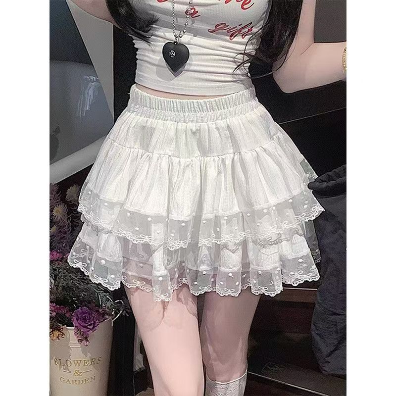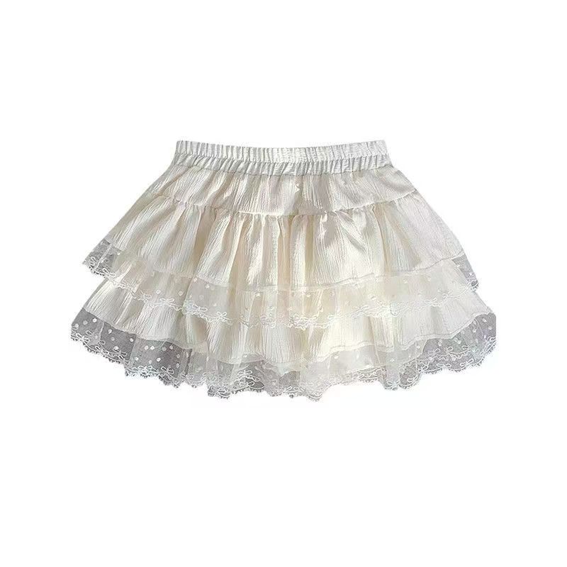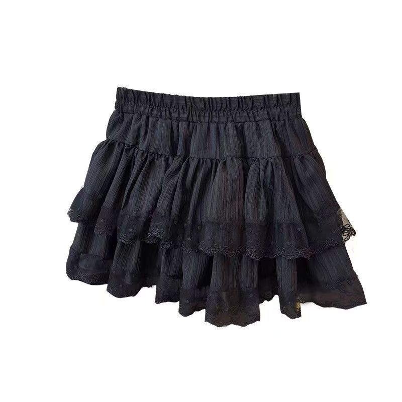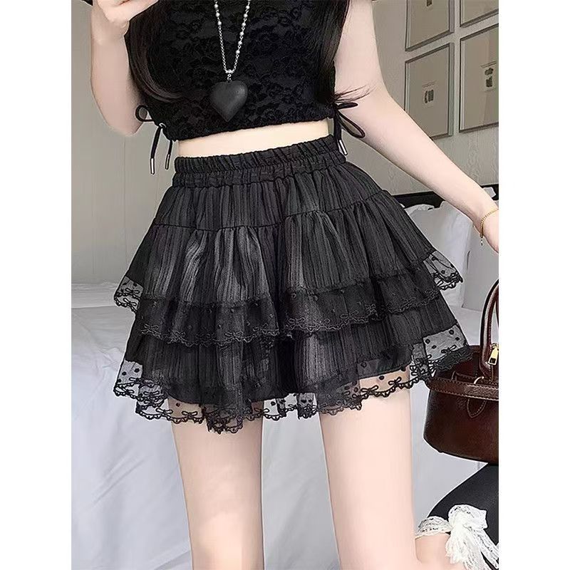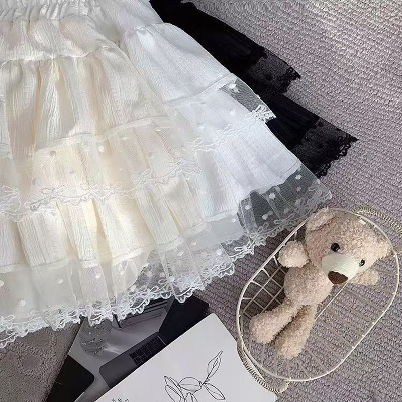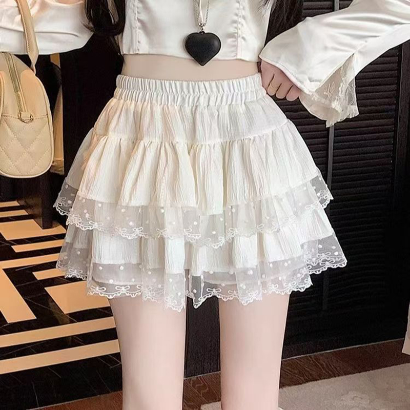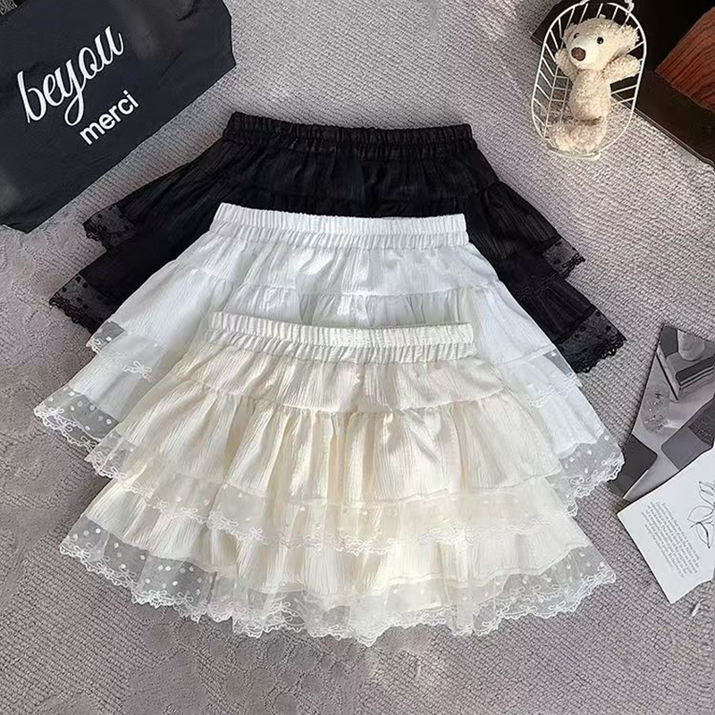 YF7447-(3色入内)韩版夏季爆款松紧腰褶折蕾丝拼接A字蓬蓬防走光蛋糕短裙