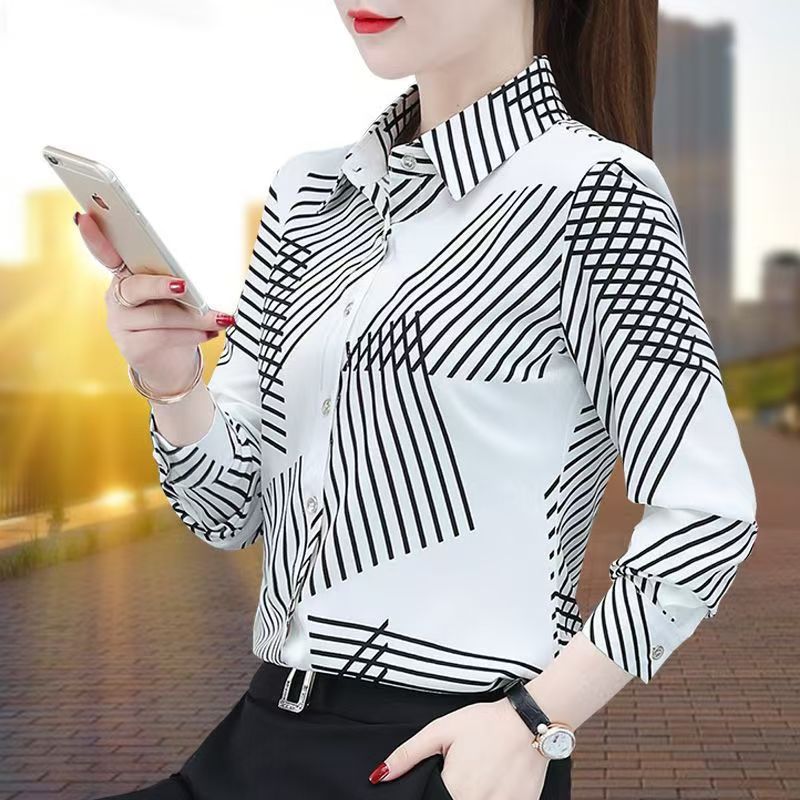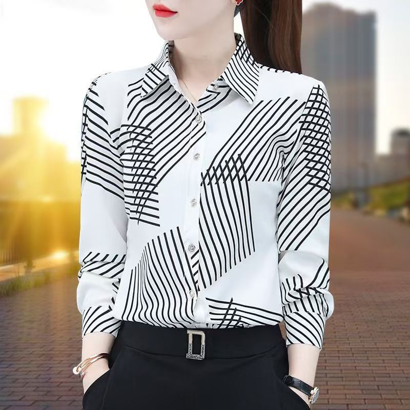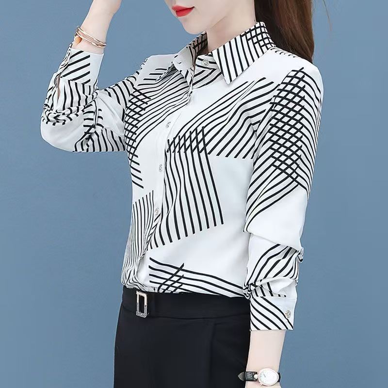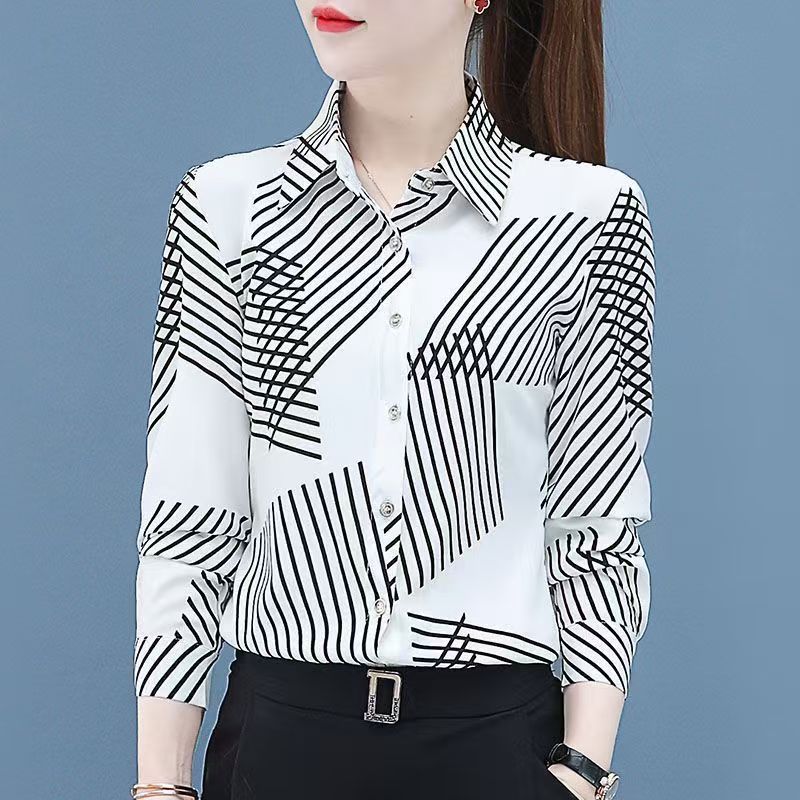 YF7448-图片色轻奢时尚不规则设计几何条纹简约百搭大码雪纺衫