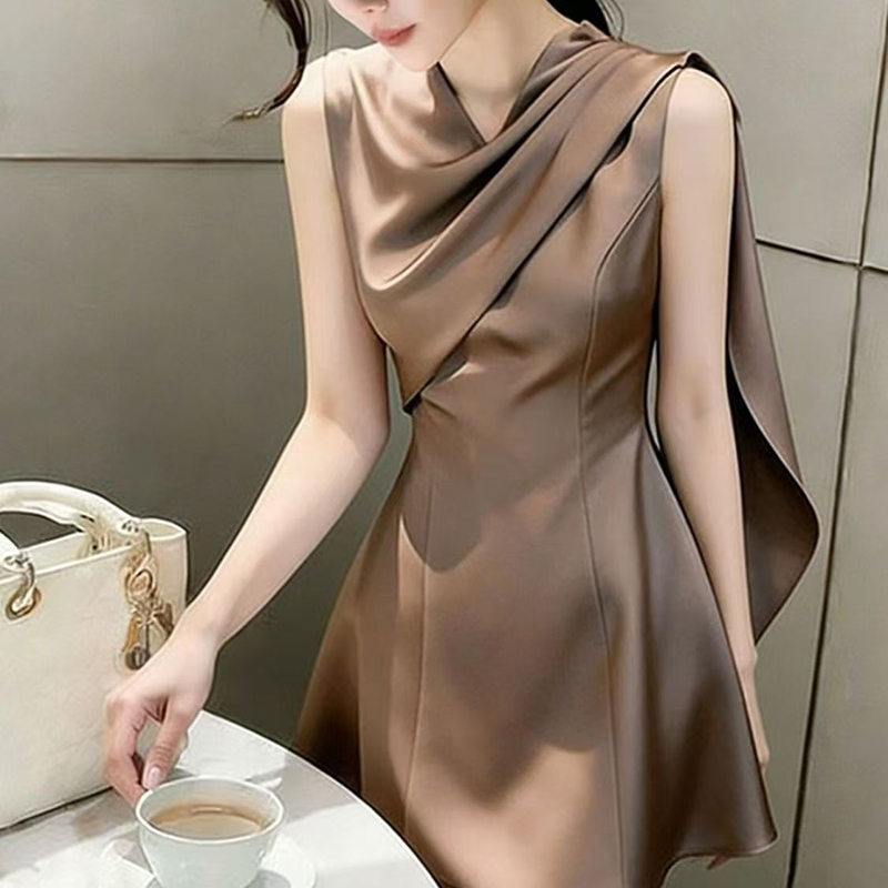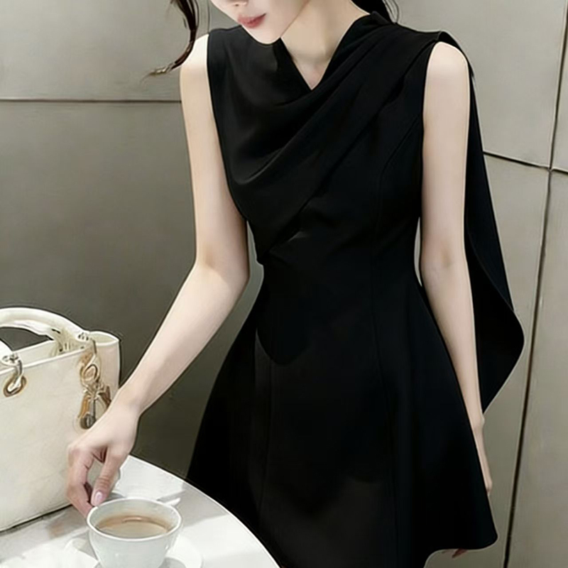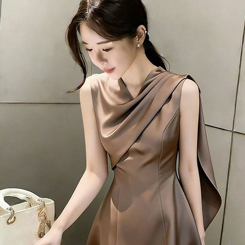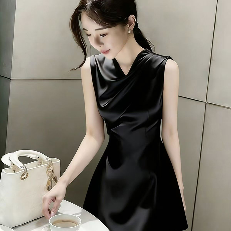 YF7449-(2色入内)时尚名媛气质无袖飘带修腰褶折感丝质高级感赫本风礼服裙子
