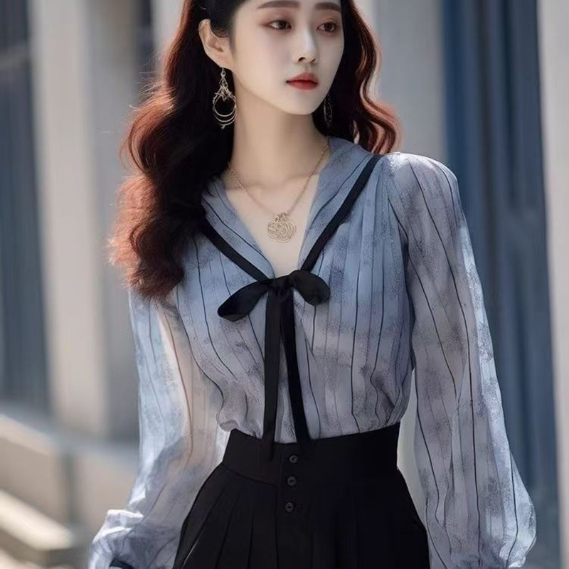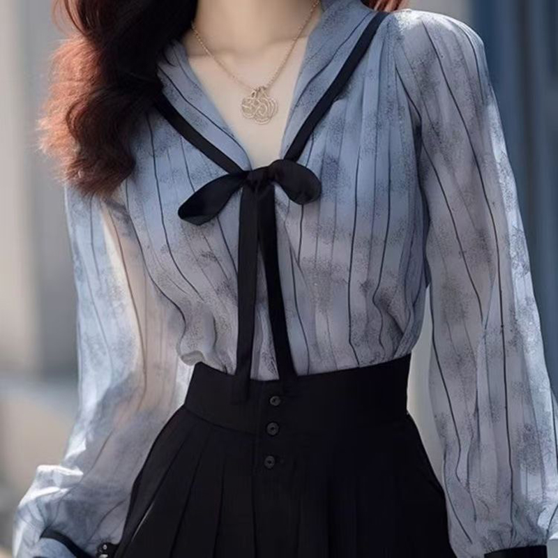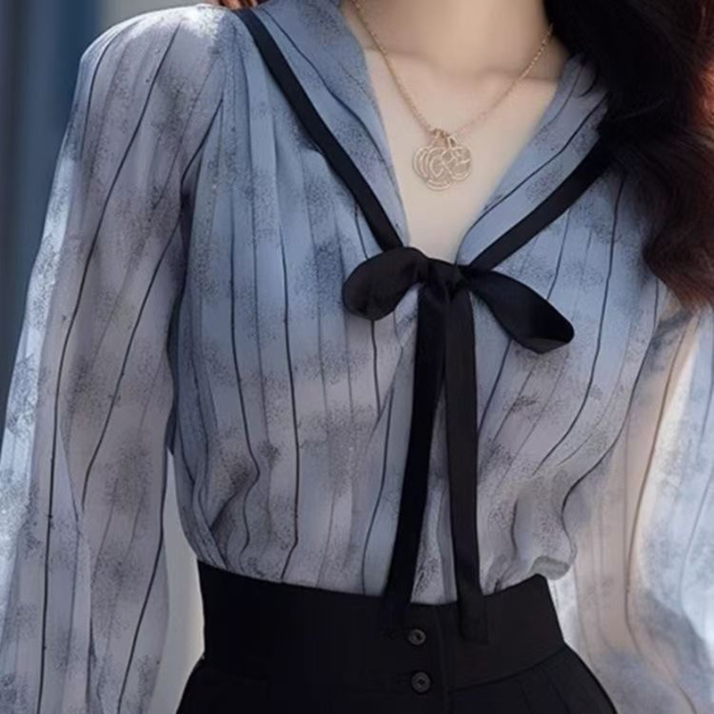 YF7451-图片色甜美时尚系带蝴蝶结撞色设计条纹蓝色宽松雪纺上衣