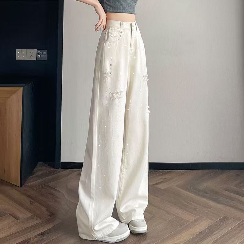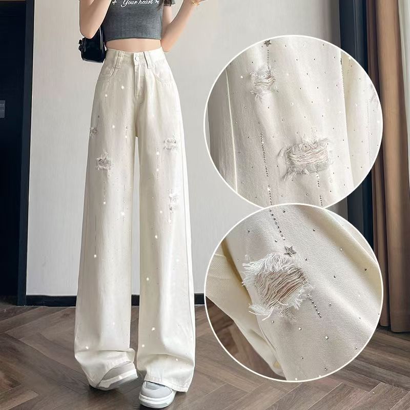 YF7453-图片色港式时尚烫钻补洞直筒坠地感白色优雅感新款牛仔裤