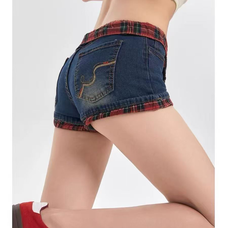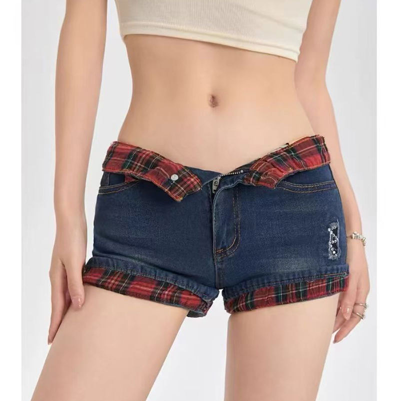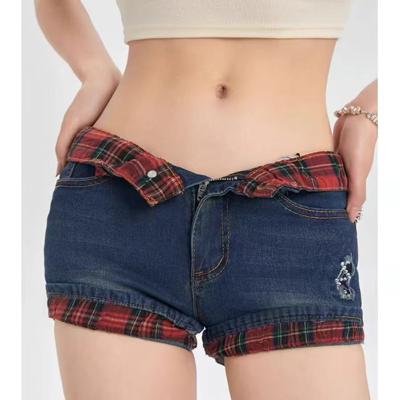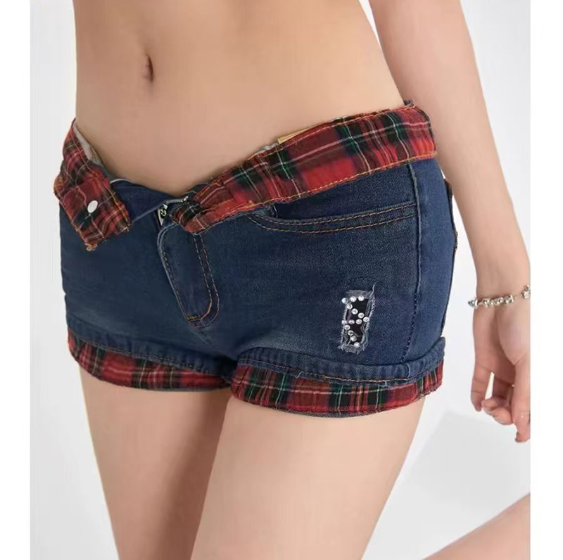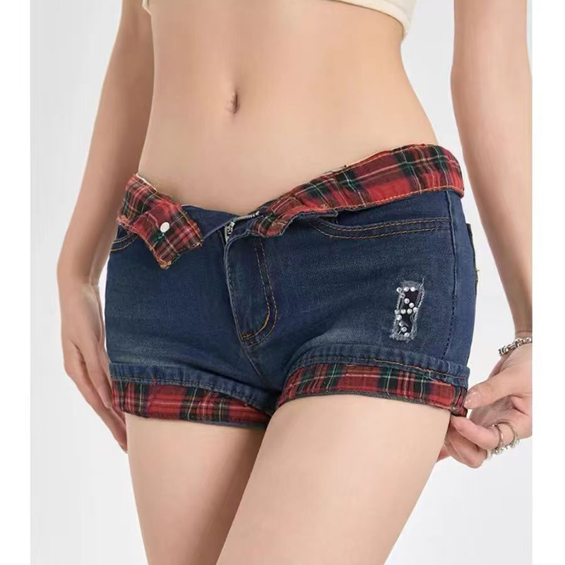 YF7454-图片色辣妹时尚夏季格子卷边低腰包臀烫钻口袋设计牛仔短裤
