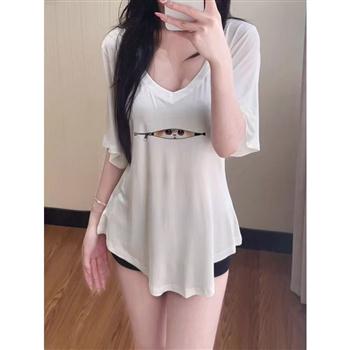 YF7477-(3色入内)慵懒风时尚蛋糕印花V领短袖宽松显瘦白色休闲百搭T恤潮