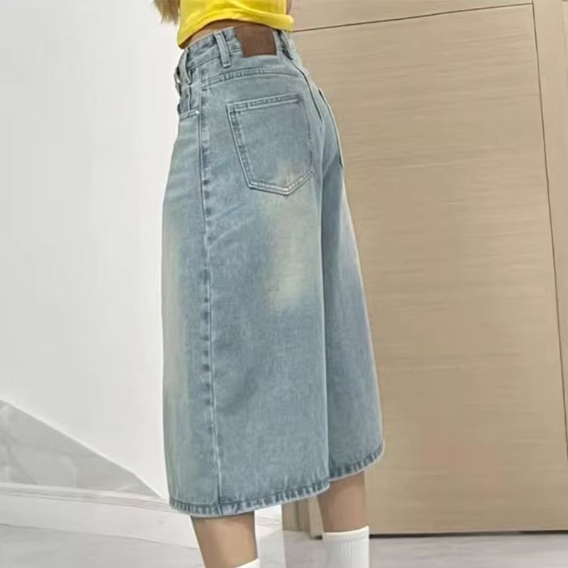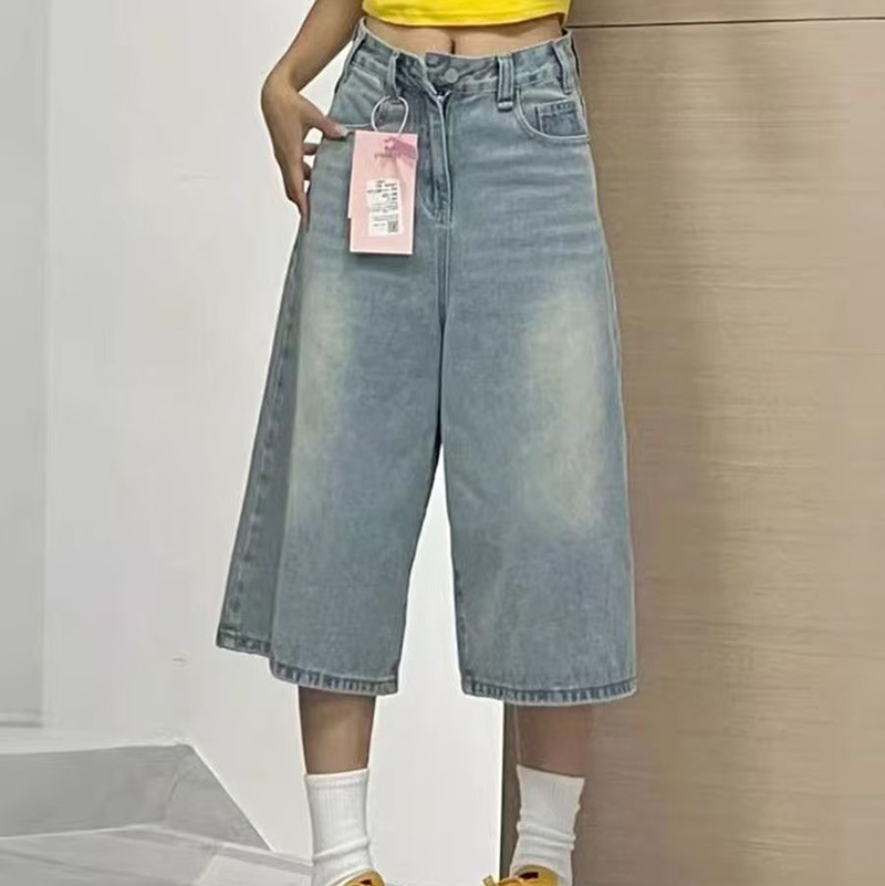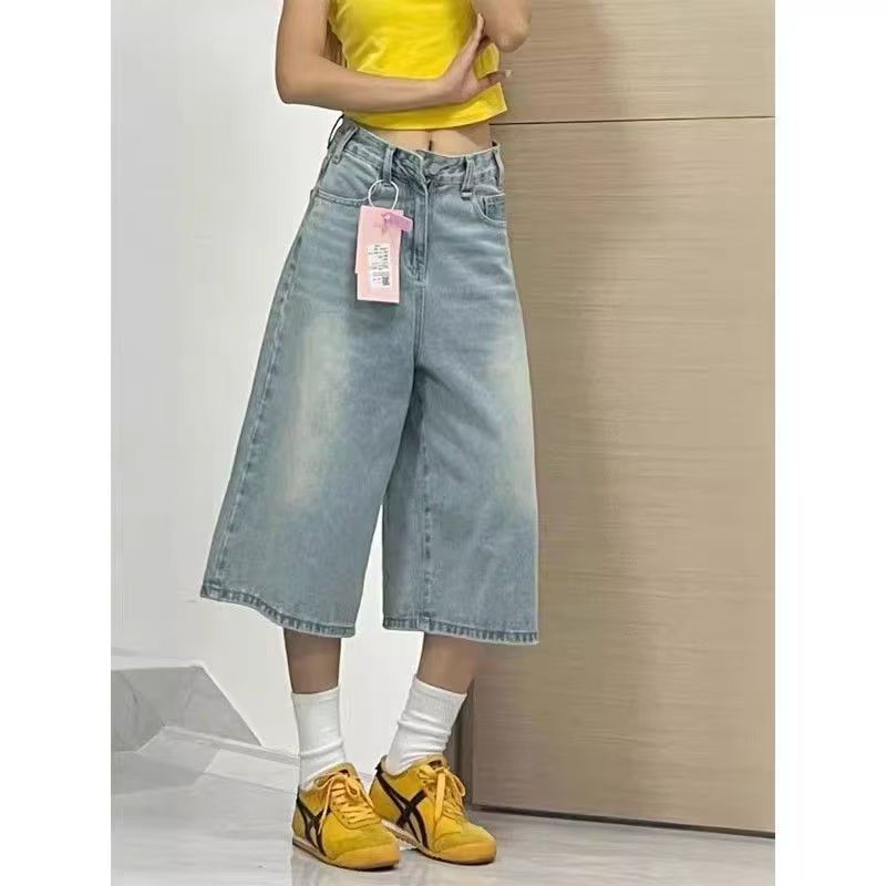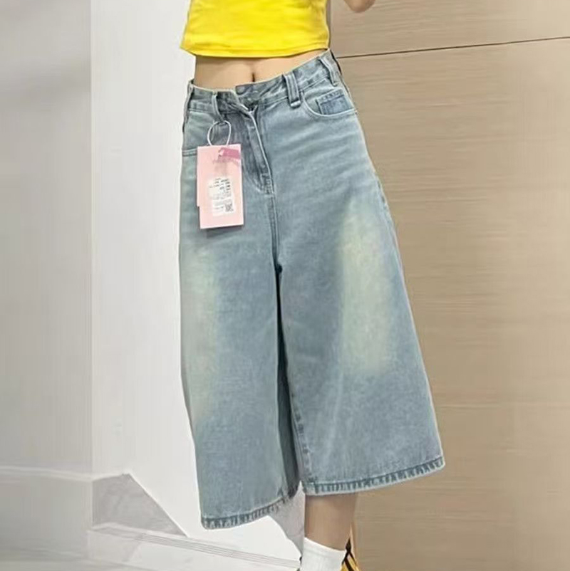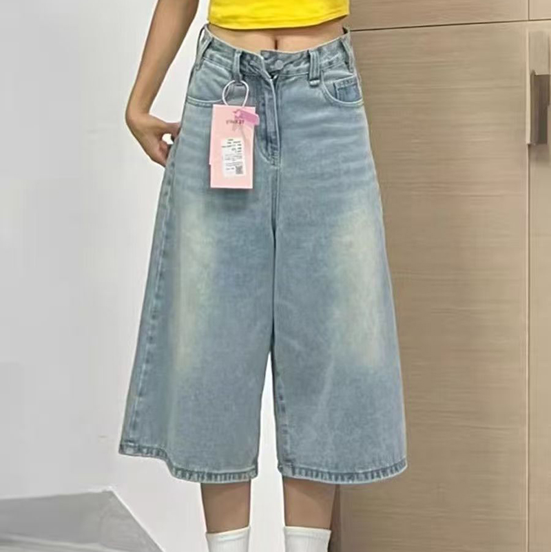 YF7487-图片色港式夏季洗水系扣直筒阔腿休闲百搭七分裤 慵懒风牛仔裤