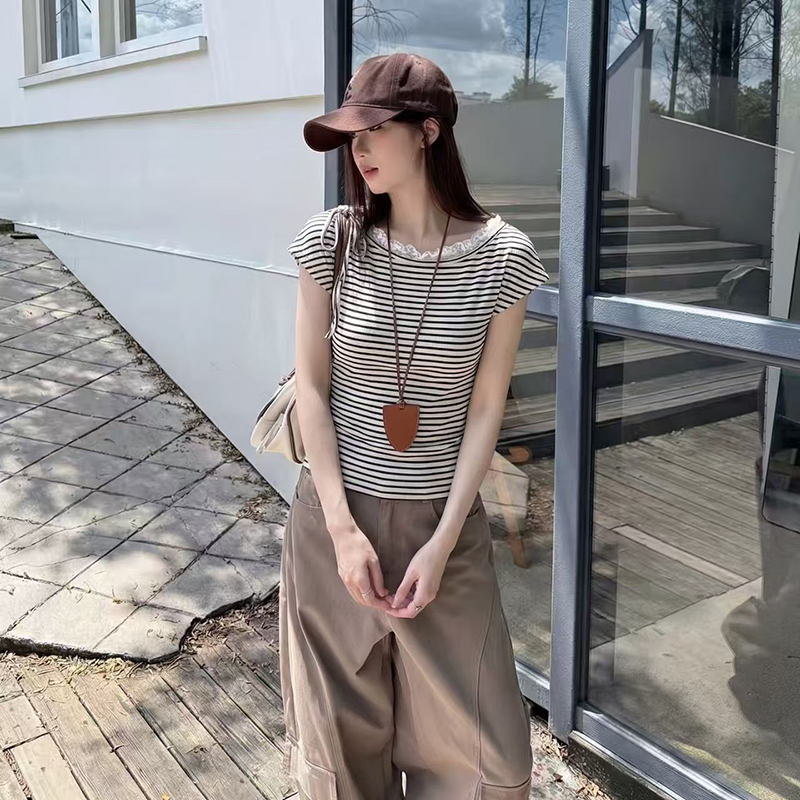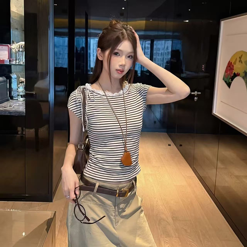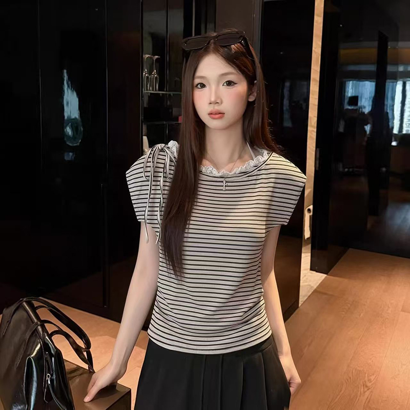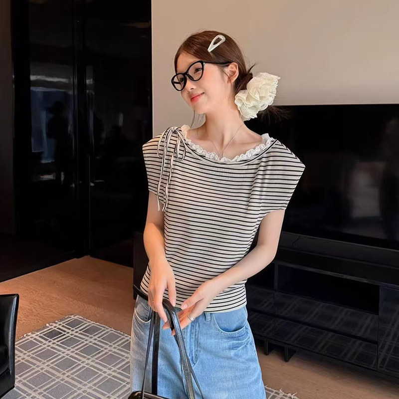 YF7494-图片色韩版小清新蕾丝边系绳条纹显瘦小众设计INS时尚休闲上衣