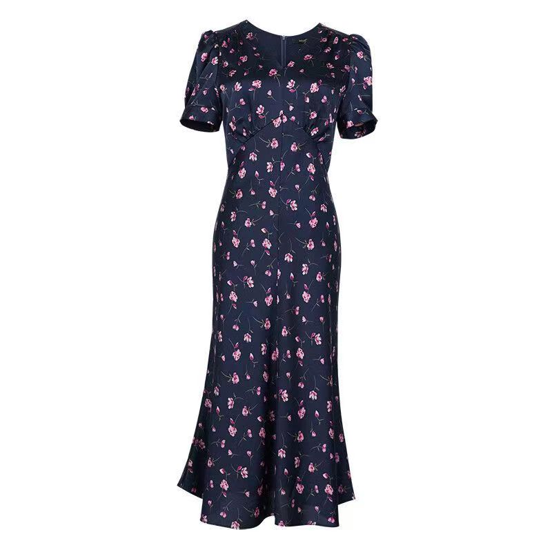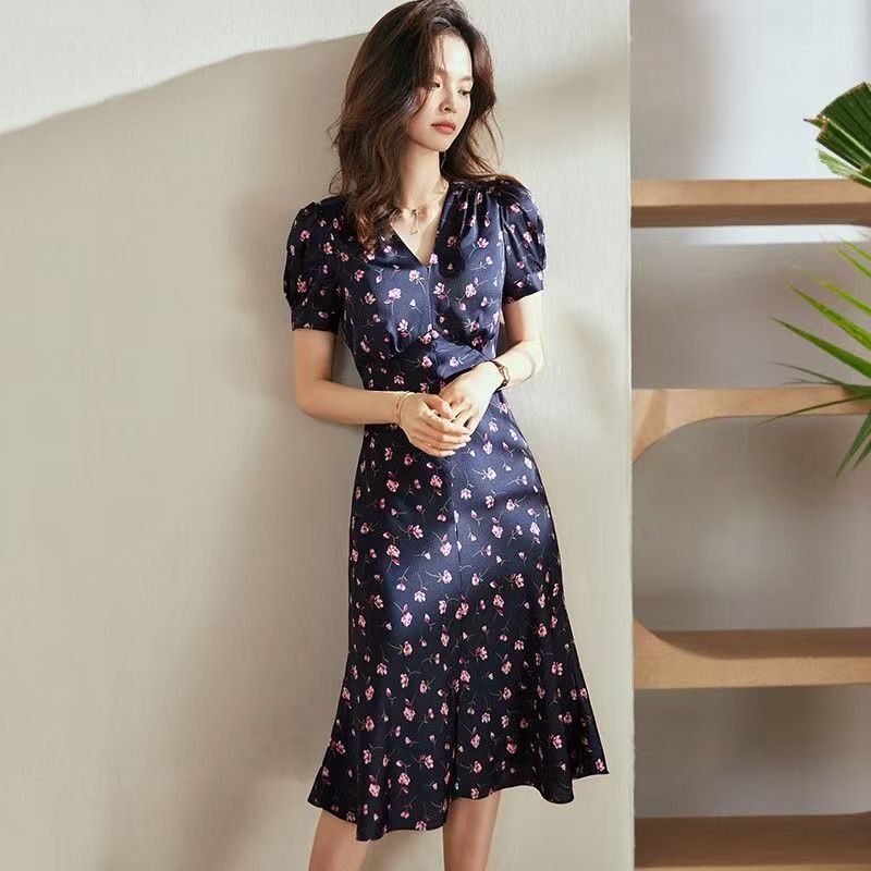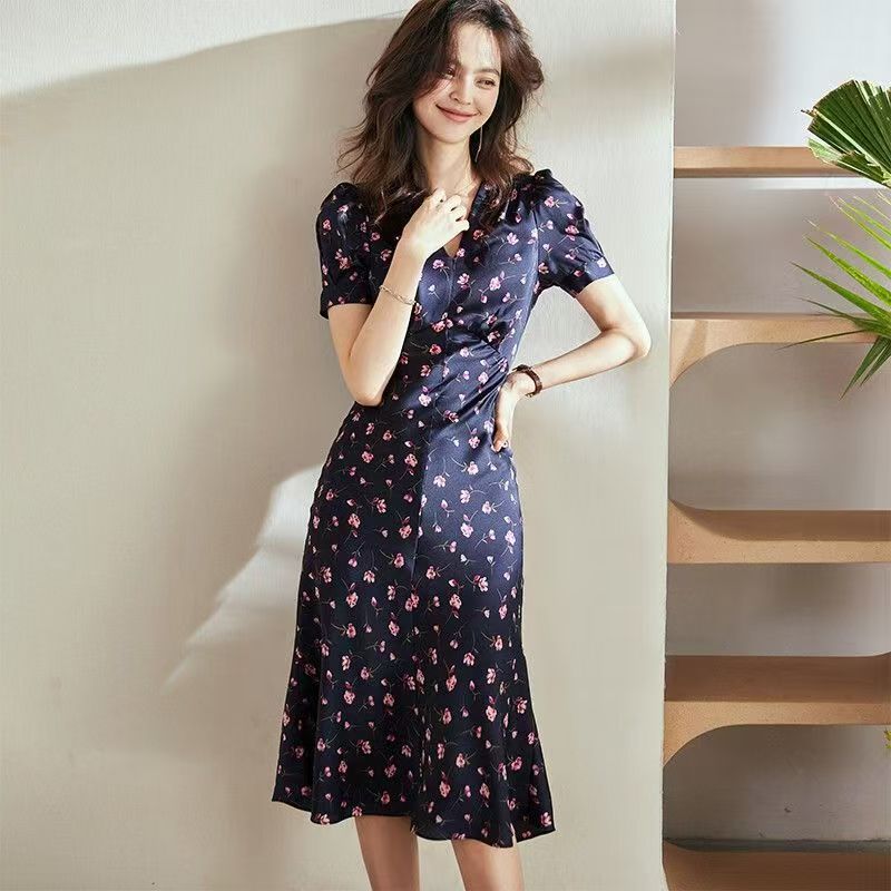 YF7512--图片色夏季简约碎花泡泡袖V领修腰鱼尾设计名媛风连衣裙