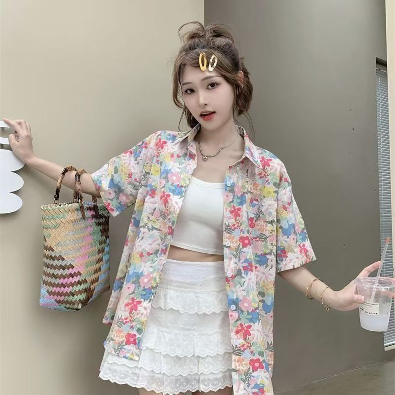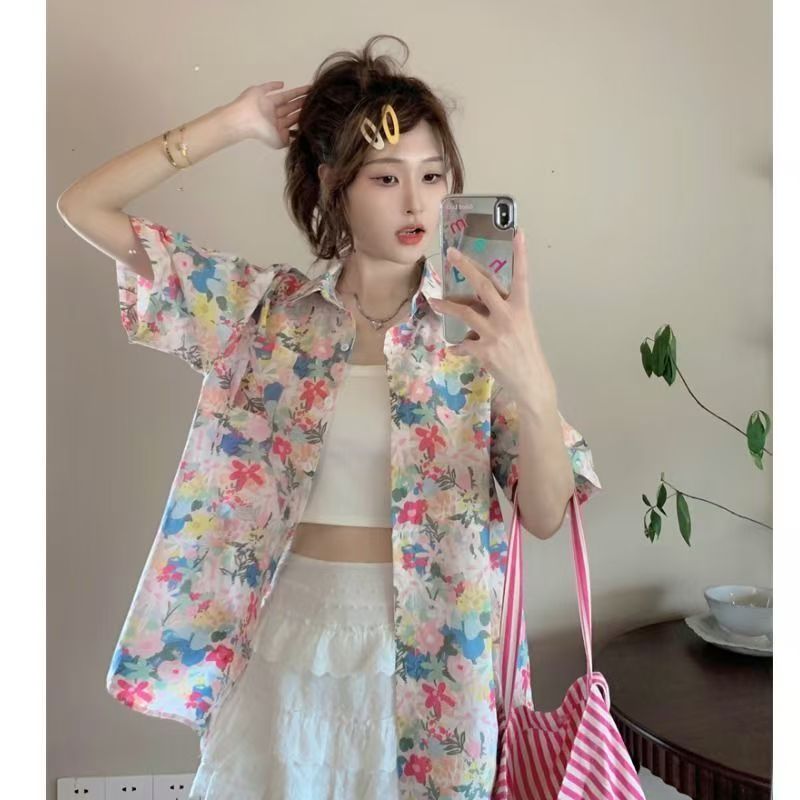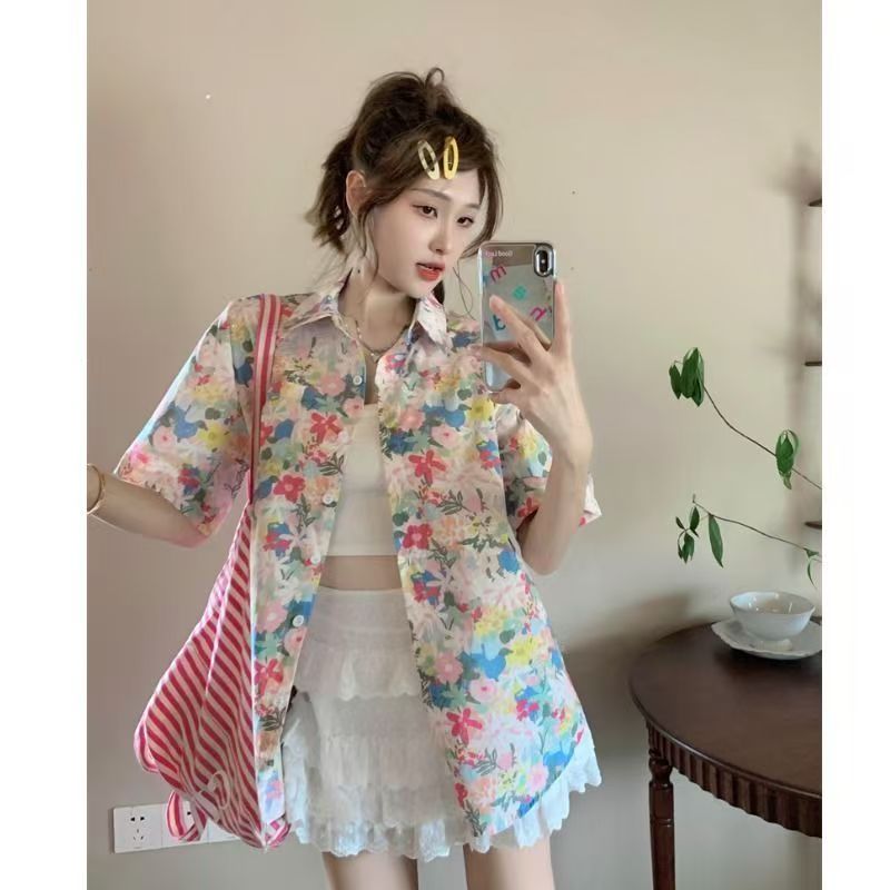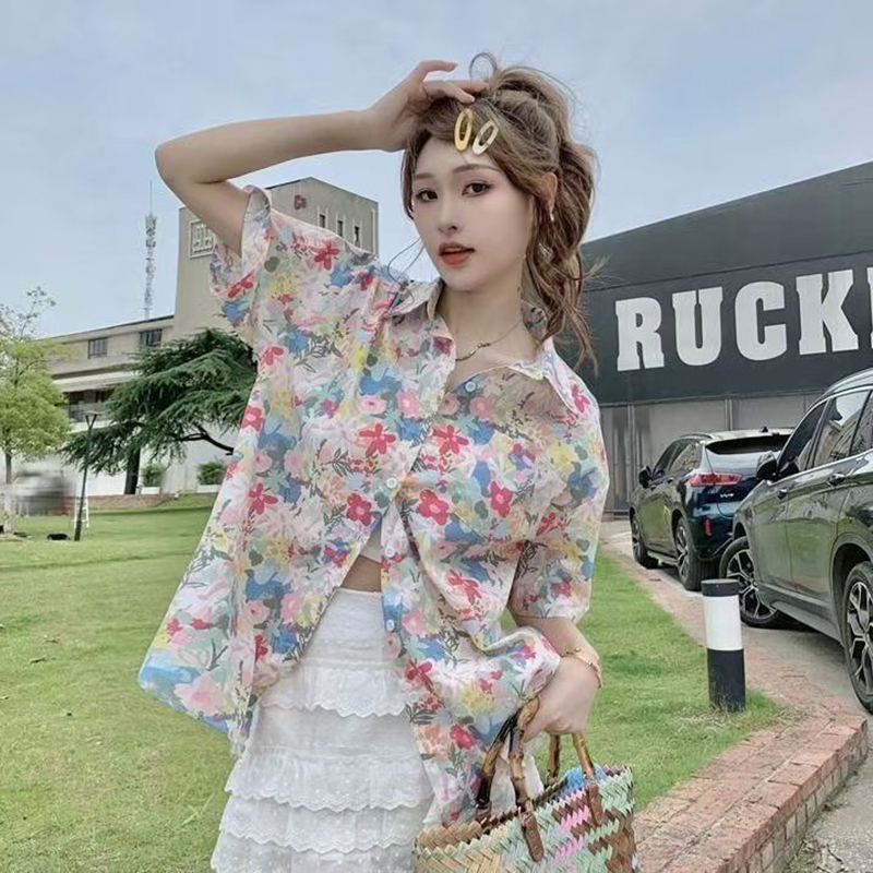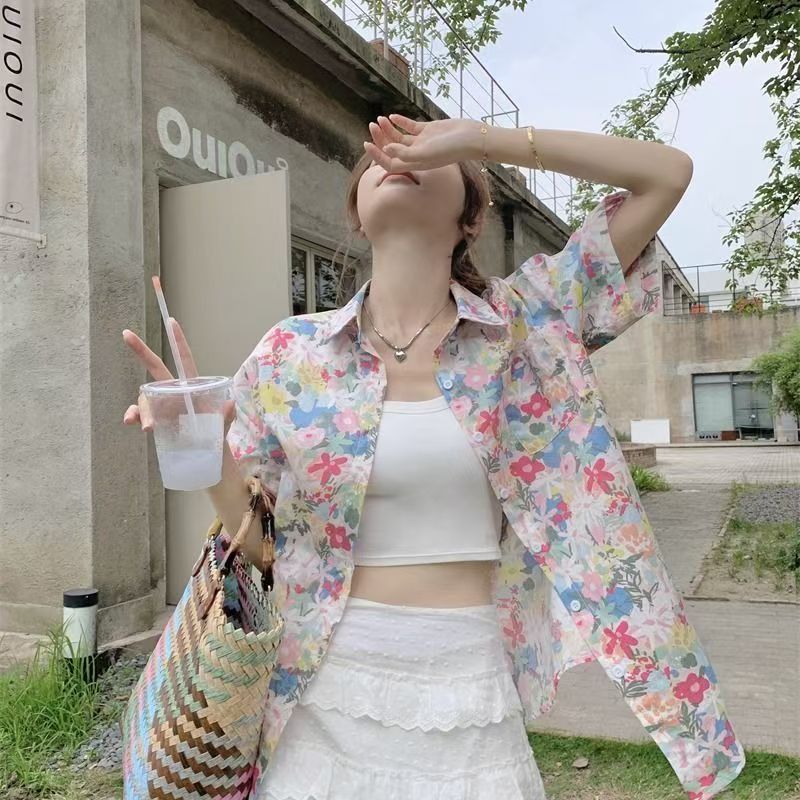 YF7515-图片色慵懒风夏季短袖碎花大码宽松显瘦复古风休闲百搭上衣