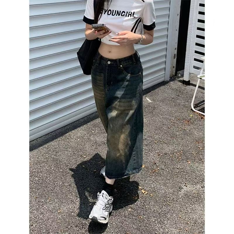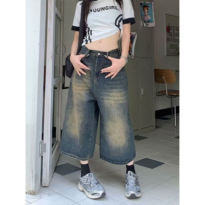 YF7517-图片色港式慵懒风复古直筒做旧小众阔腿七分裤 夏季休闲牛仔裤