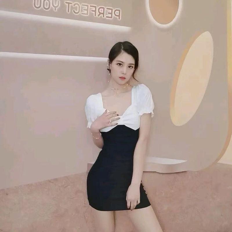 YF7532-(3色入内)纯欲风夏季短袖套头二色拼接裹胸收腰褶折包臀连衣裙