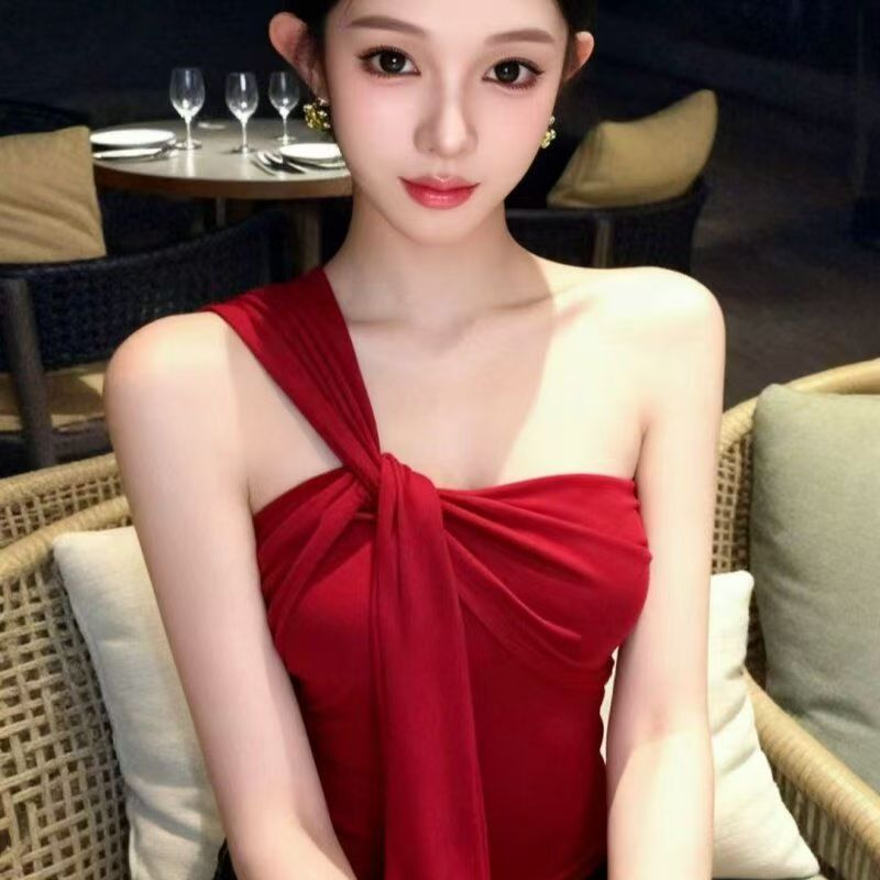 YF7535-(3色入内)性感时尚夏季辣妹单肩吊带扭纹飘带弹力收腹一体褶感上衣