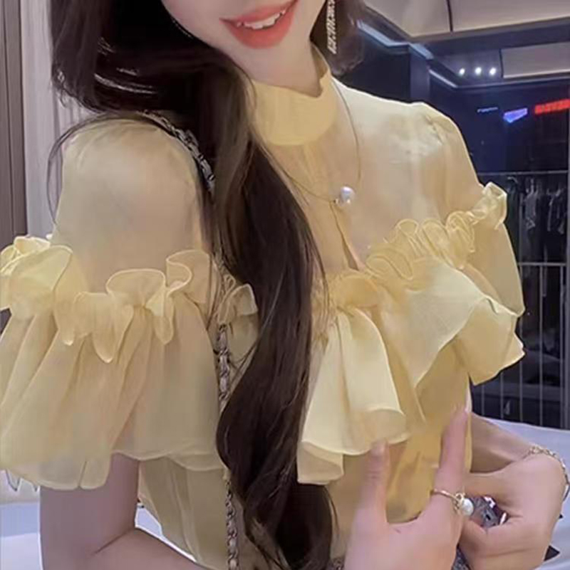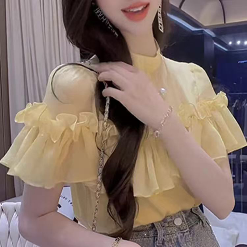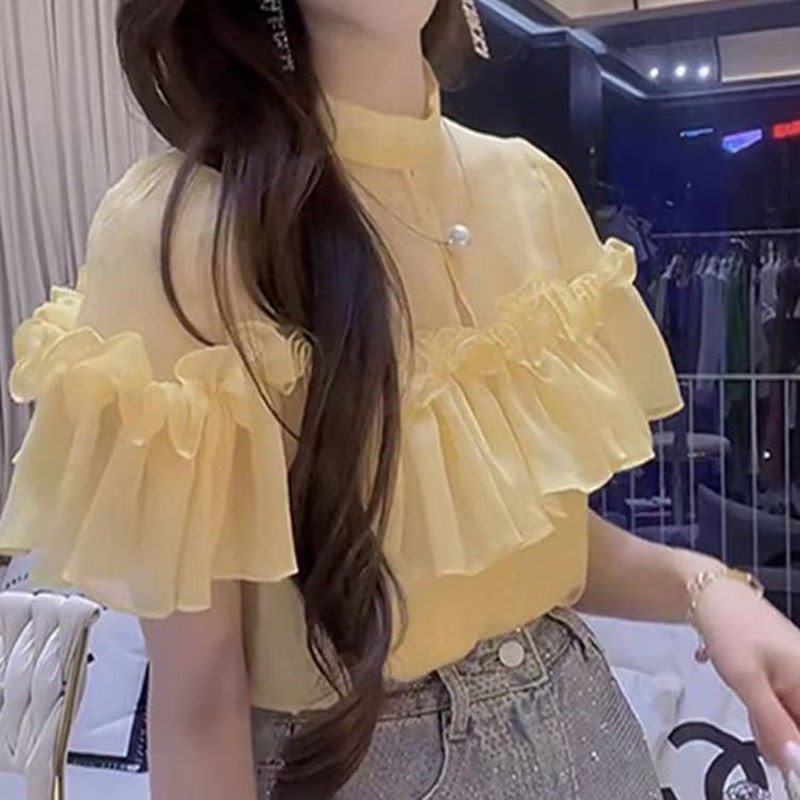 YF7537-图片色甜美别致荷叶边网纱拼接飘逸感夏季小众黄色雪纺衫