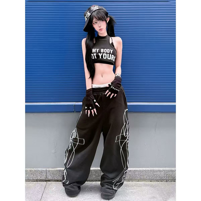 YF7539-图片色港式学院风不规则立体刺绣图腾印花阔腿运动休闲裤