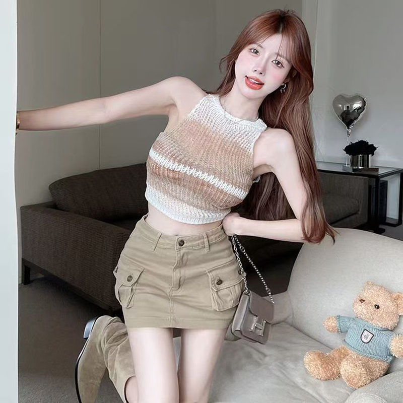 YF7540--图片色夏季时尚系扣工装口袋A字包臀紧身辣妹牛仔短裙