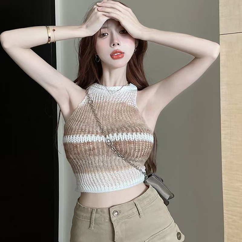 YF7500-图片色韩版纯欲风黑白纹一字肩飘带设计感弹力修腰复古显瘦上衣