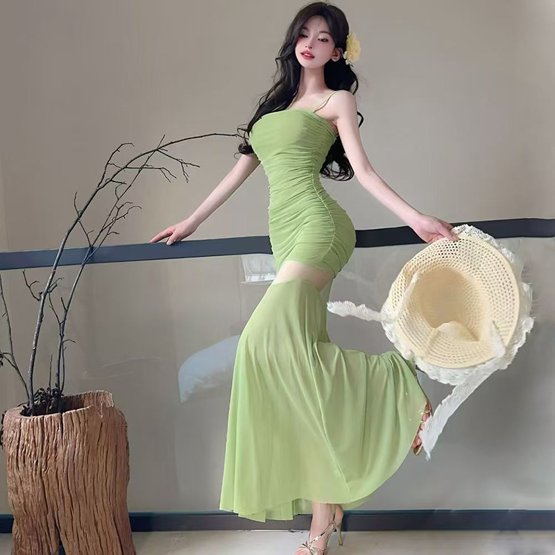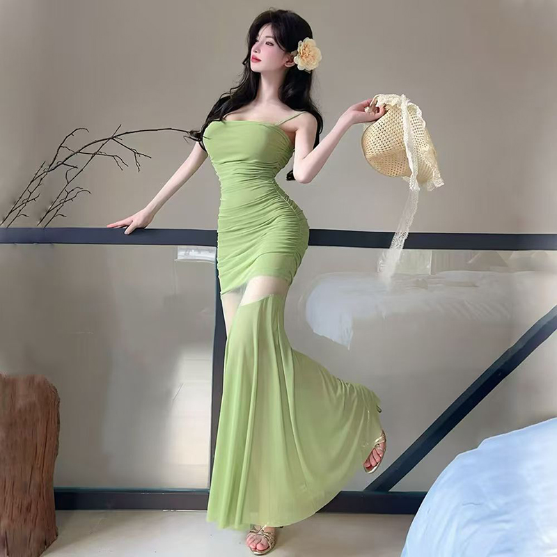 YF7543-图片色名媛气质夏季吊带抹胸微喇叭镂空网纱拼接鱼尾礼服长裙