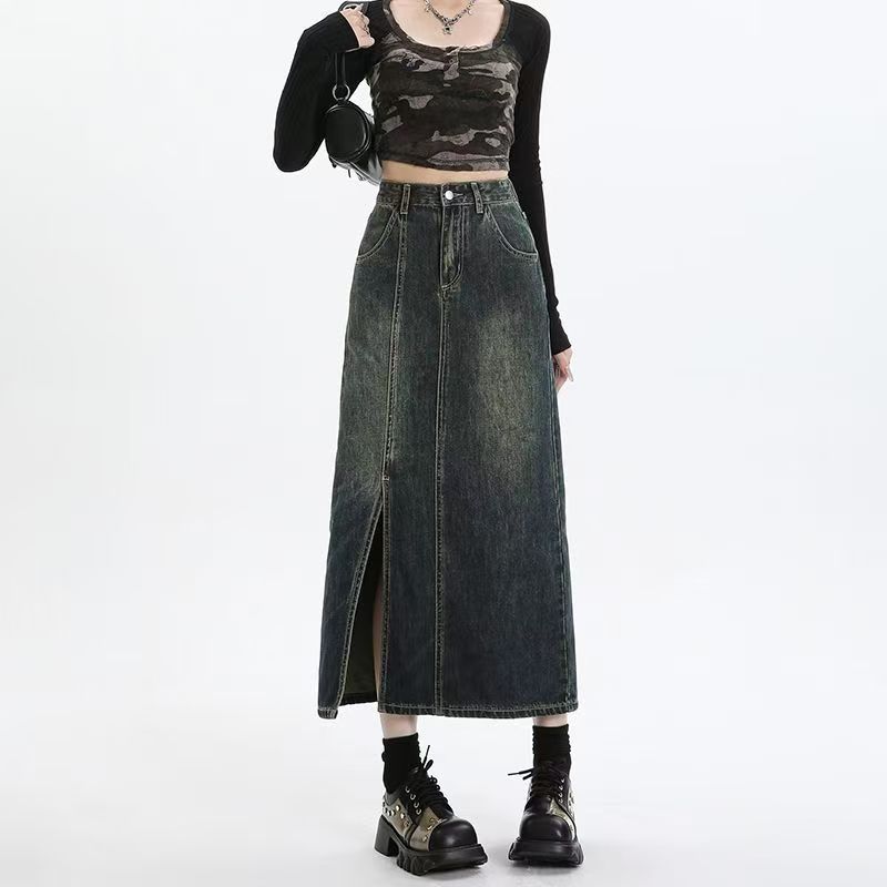 YF7545--图片色复古蓝高腰系扣洗水开叉拼接中长款夏季慵懒风牛仔裙
