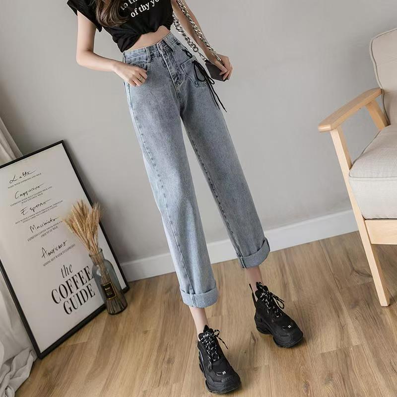 YF7552-图片色复古港式个性穿孔绑绳设计直筒坠地感九分阔腿牛仔裤