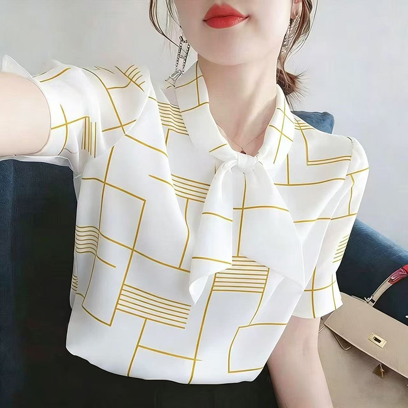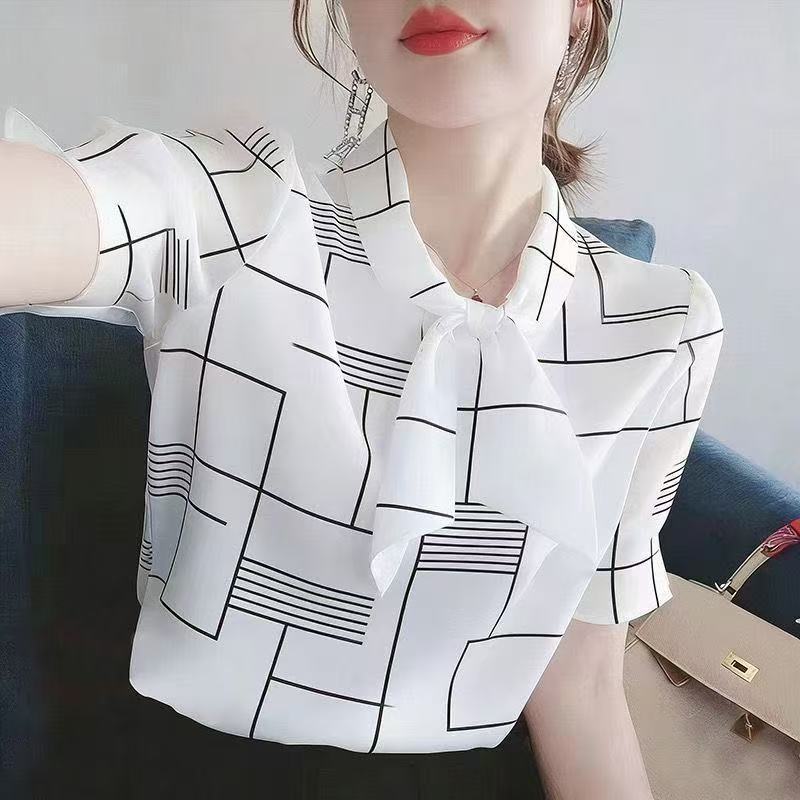 YF7554-(4色入内)甜美时尚个性不规则线条系蝴蝶结短袖宽松大码雪纺衫