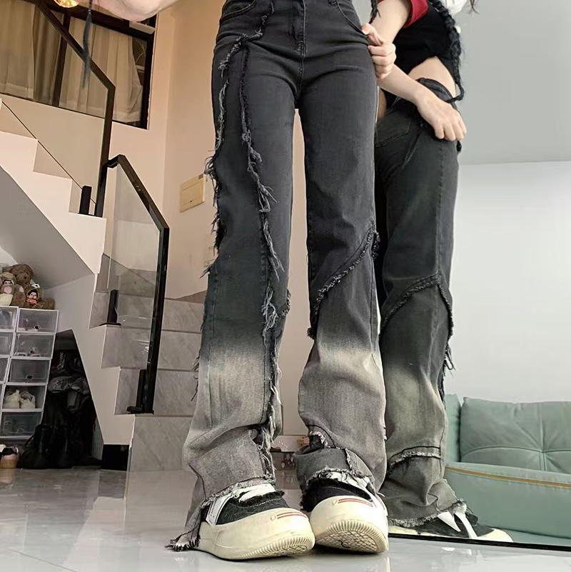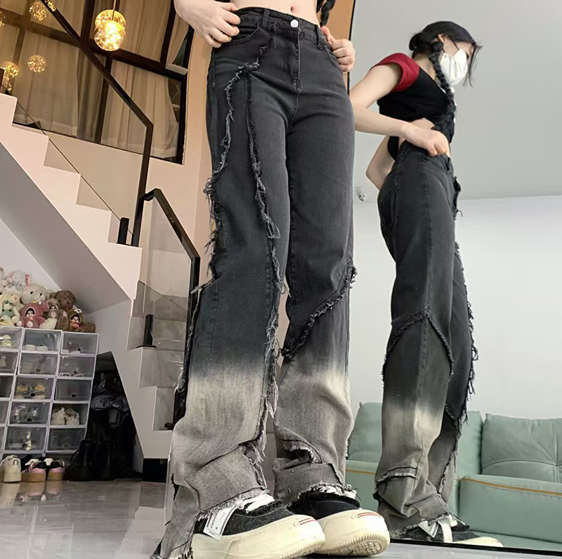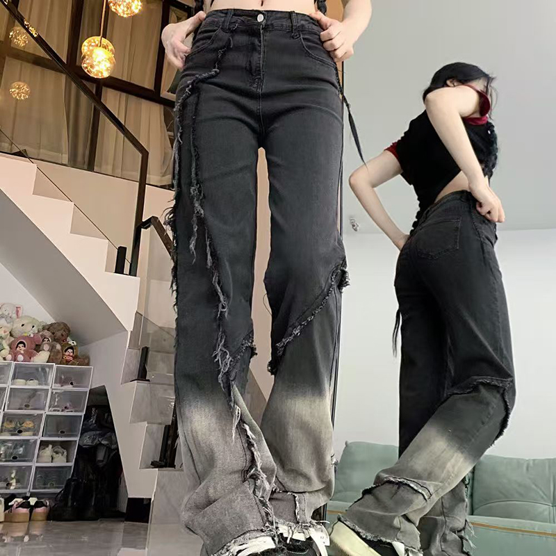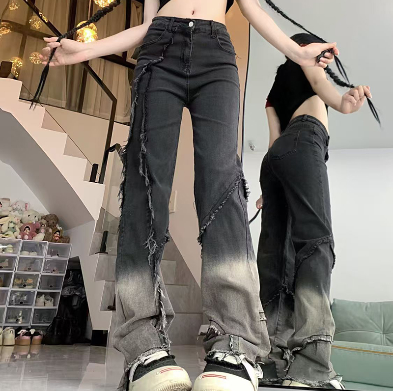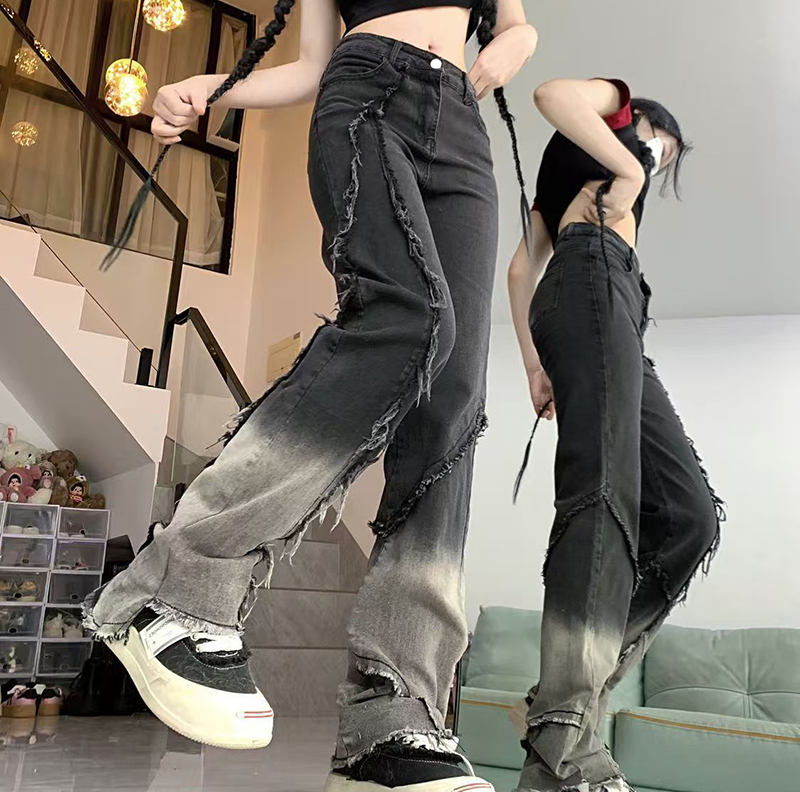 YF7555-图片色美式复古洗水渐变弧边流苏设计高腰直筒慵懒风牛仔裤